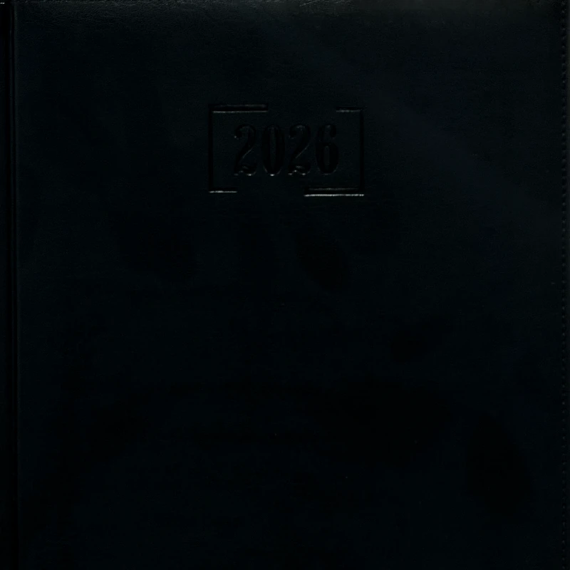 Elegante y sobria, con acabado tipo cuero color Negro y grabado metálico del año. Ideal para ejecutivos que buscan estilo y organización.