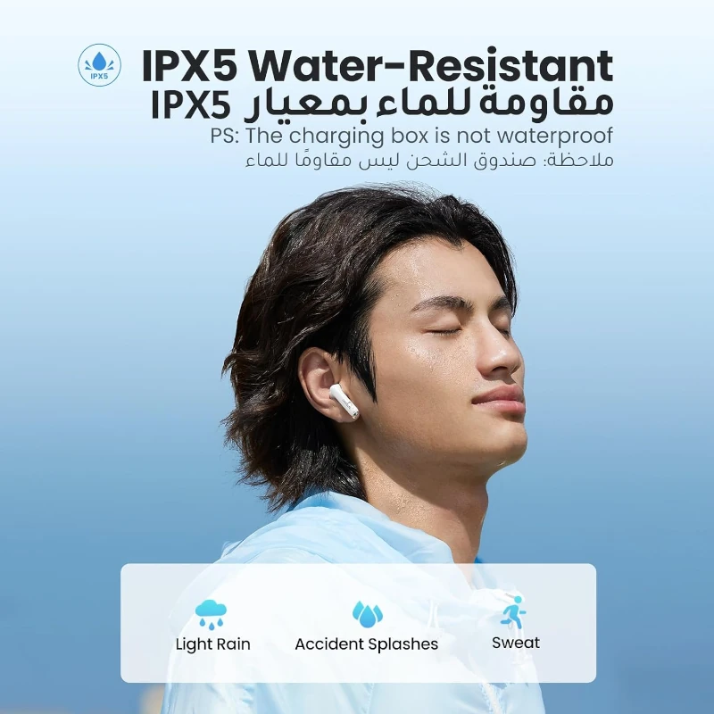 - Resistente al agua IPX5:Nota: La caja de carga no es resistente al agua.