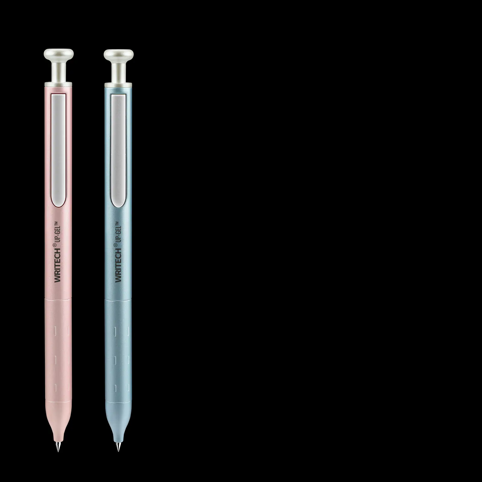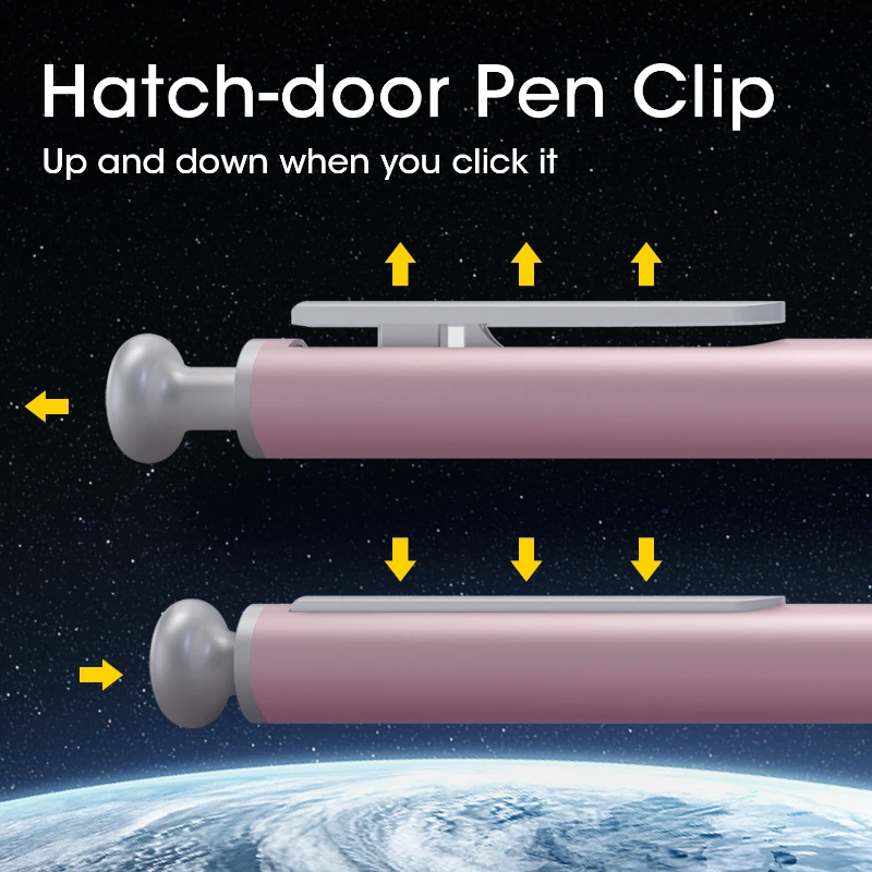- Diseño exclusivo de clip para bolígrafo tipo puerta de escotilla, que sube y baja cuando retrae los bolígrafos.