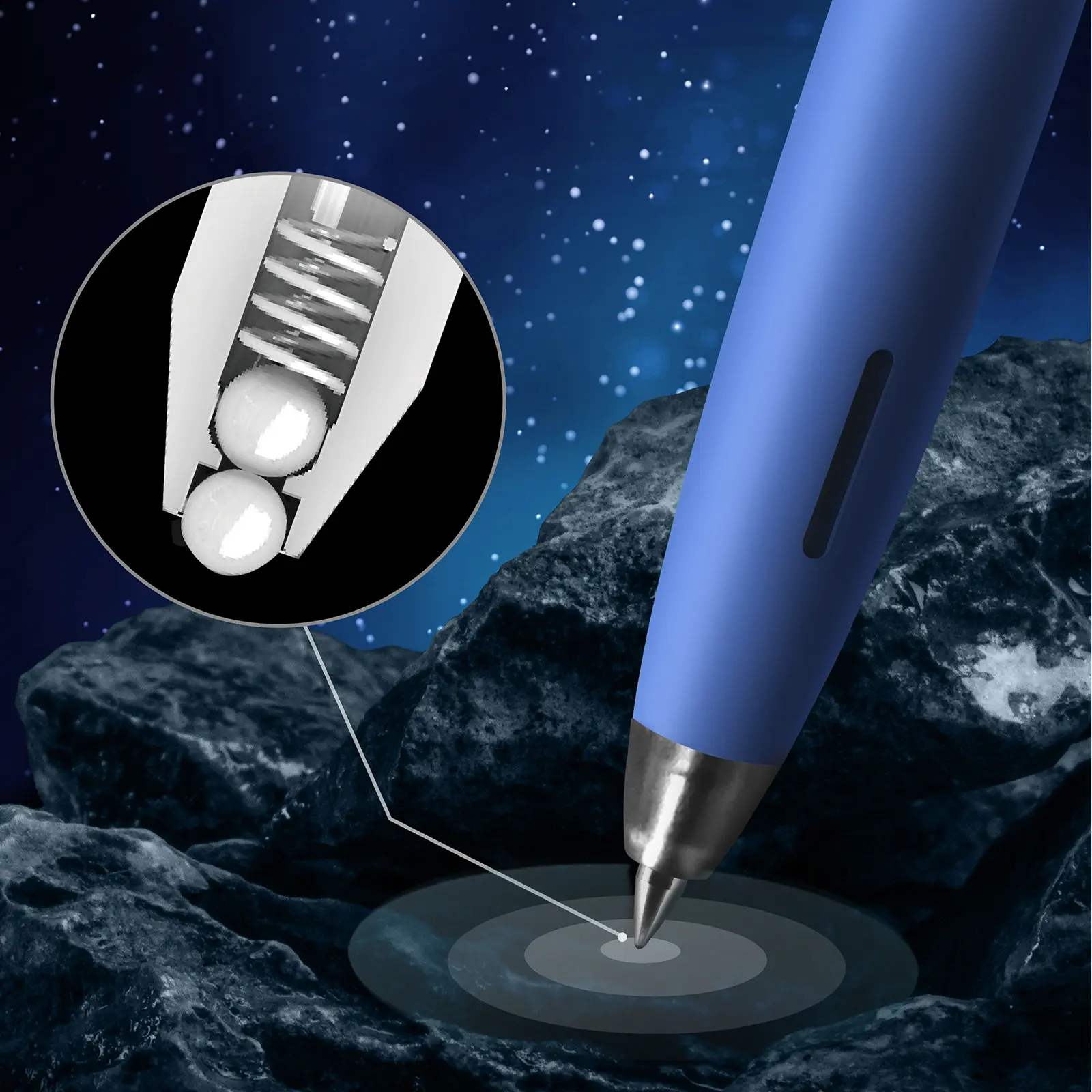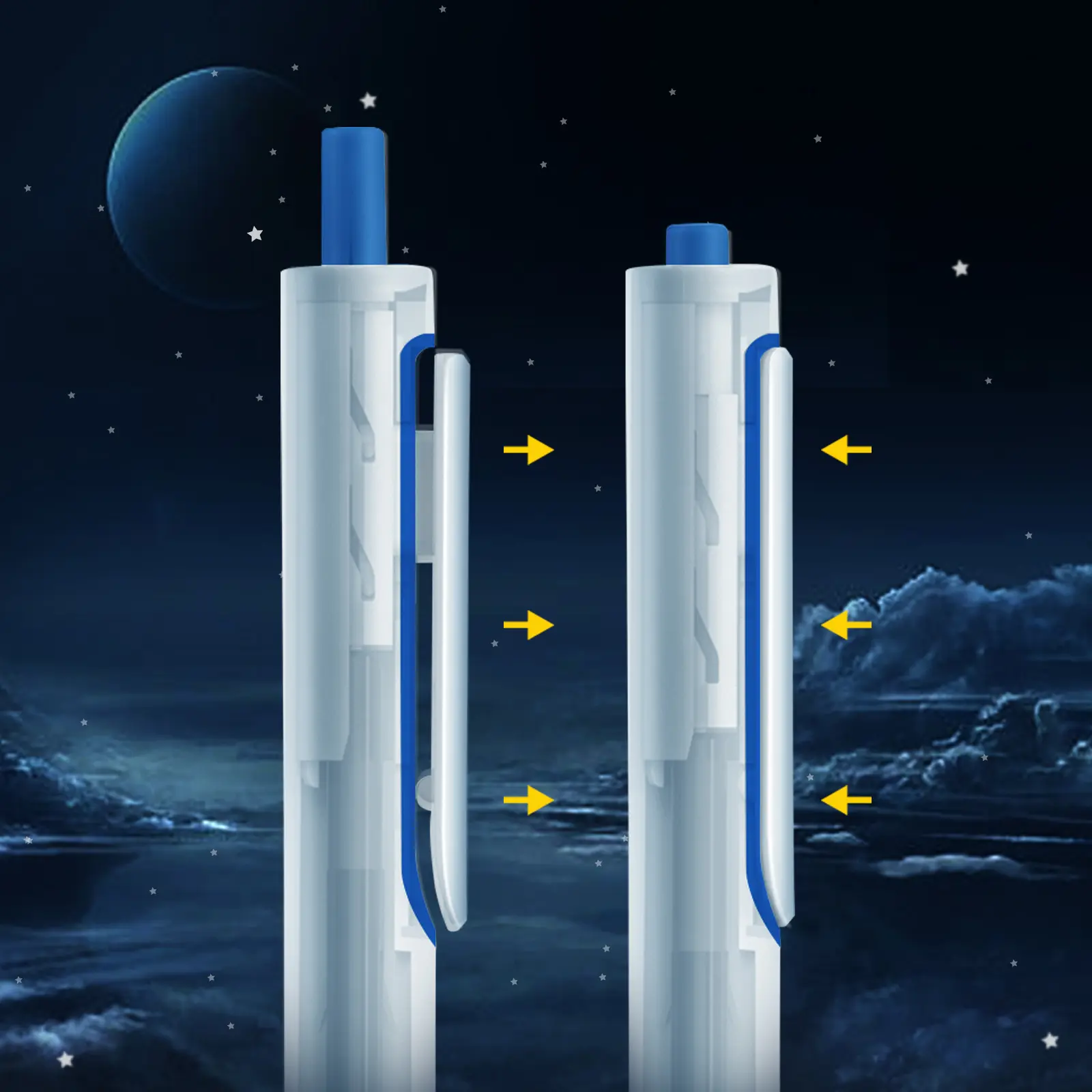 - Diseño de clip para bolígrafo tipo puerta de escotilla. Hacia arriba y hacia abajo cuando retraen los bolígrafos.