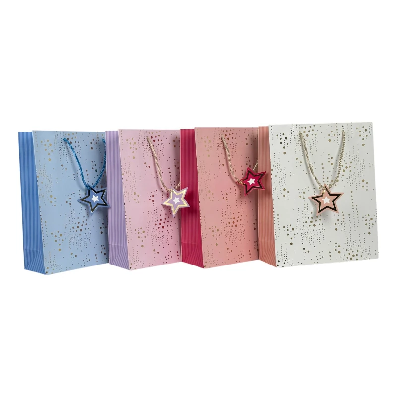 Sorprende con estilo en cualquier celebración con estas elegantes bolsas de regalo Merletto. Su diseño moderno con detalles metálicos y colgante en forma de estrella añade un toque especial.