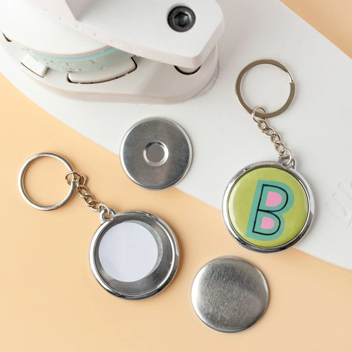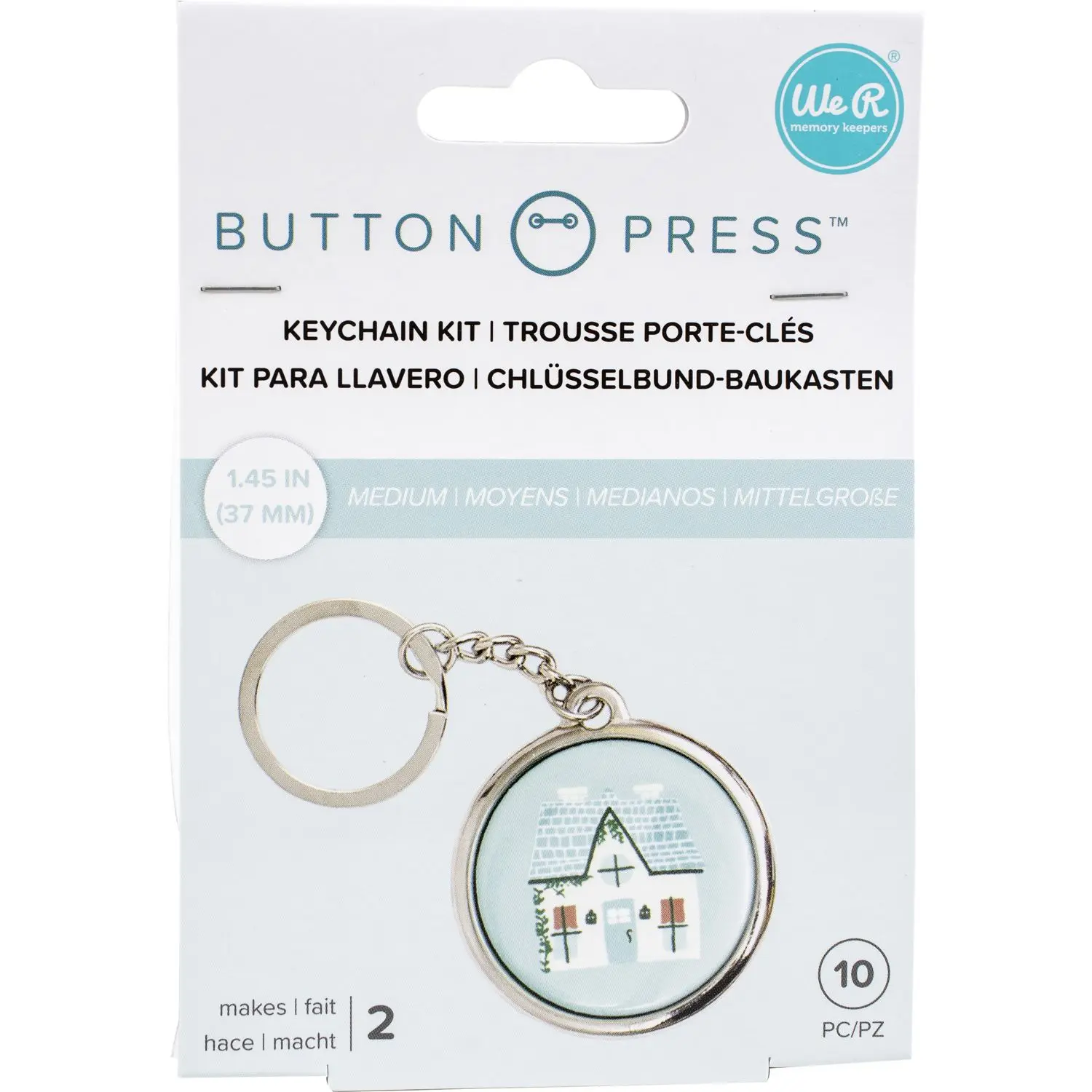 ¡Crea llaveros únicos con este kit! Úselo con pulsador de botón e inserciones medianas (se venden por separado). Este paquete contiene diez piezas para hacer dos llaveros de 1,45 pulgadas. Importado.