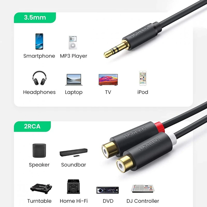 - El cable adaptador UGREEN estéreo macho de 3,5 mm a 2 RCA hembra es ideal para adaptar la salida de su PC o audio personal a conectores RCA estéreo para una transición rápida de auriculares a conexión rca.