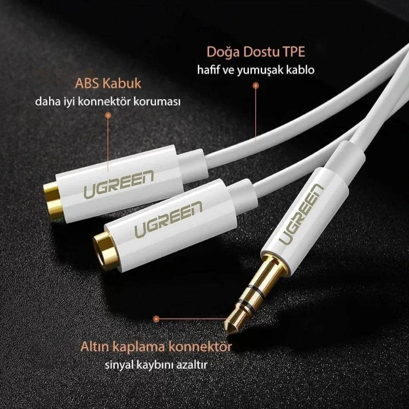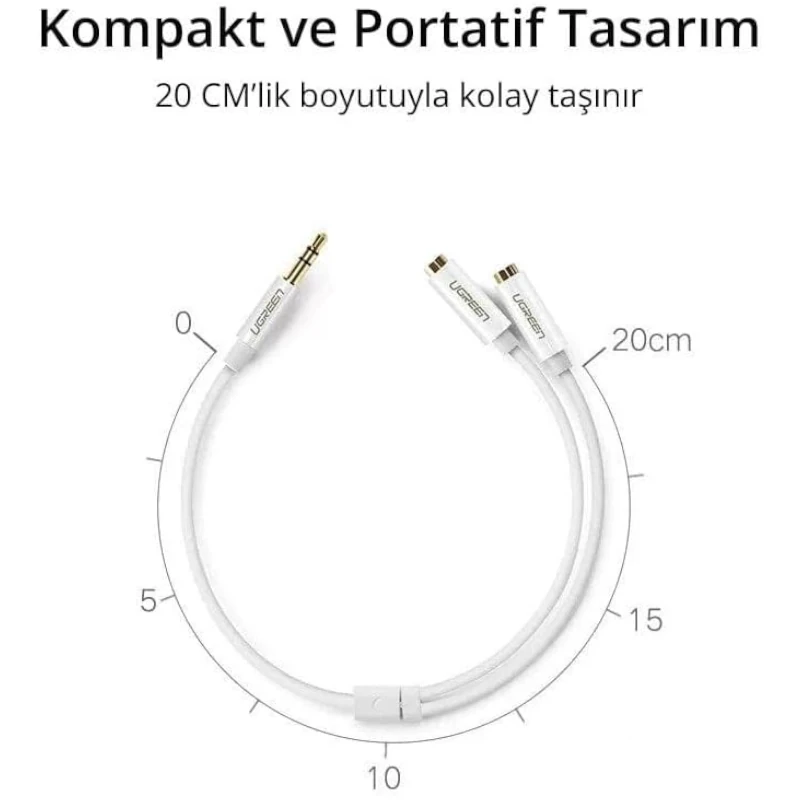 El cable divisor estéreo de audio UGreen convierte un solo conector estéreo de 3,5 mm en 2 conectores estéreo de 3,5 mm. Este divisor permite que 2 personas escuchen audio a través de auriculares desde la misma fuente.