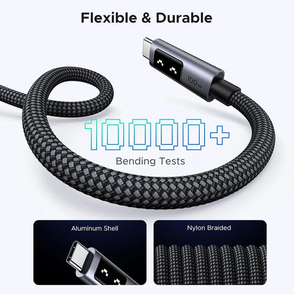 Construido con materiales premium como aluminio y nailon trenzado, el cable es resistente al desgaste, torsiones y enredos,