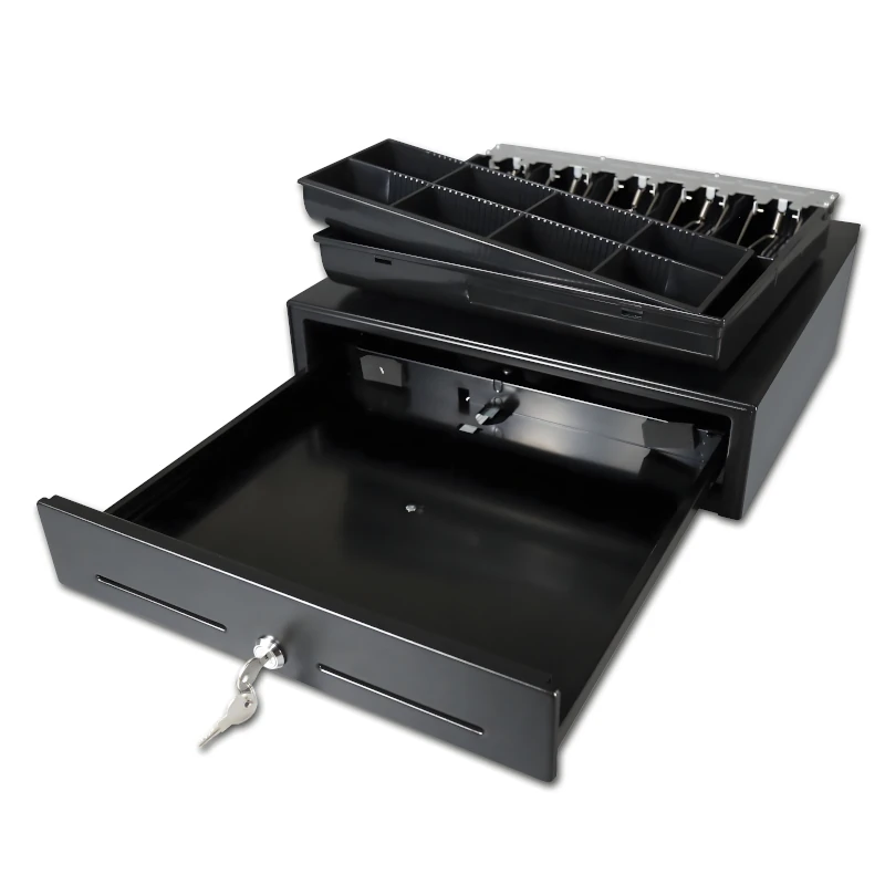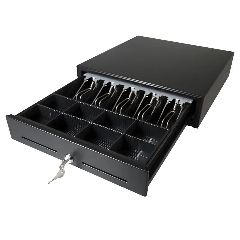Cajón de dinero metálico ideal para puntos de venta. Ofrece organización eficiente, alta seguridad y operación confiable para comercios con alto flujo diario.