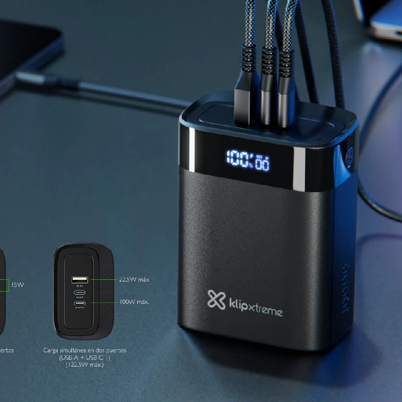 - Este banco de energía se recarga en 2,5 h a través de USB-C®, cuatro veces la velocidad estándar4.