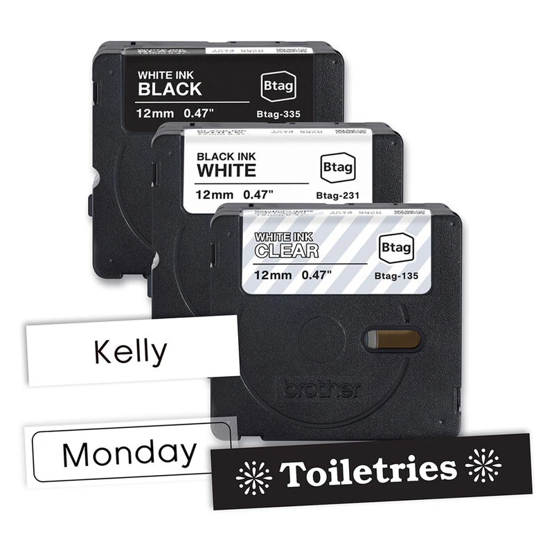 Este juego de tres rollos de cinta de etiquetas Btag es compatible con las rotuladoras Brother P-Touch PT-N10, PT-N20 y PT-N25BT. Cada rollo mide 1,37 cm x 30,96 cm e incluye texto blanco sobre cinta transparente, texto negro sobre cinta blanca y texto blanco sobre cinta negra.