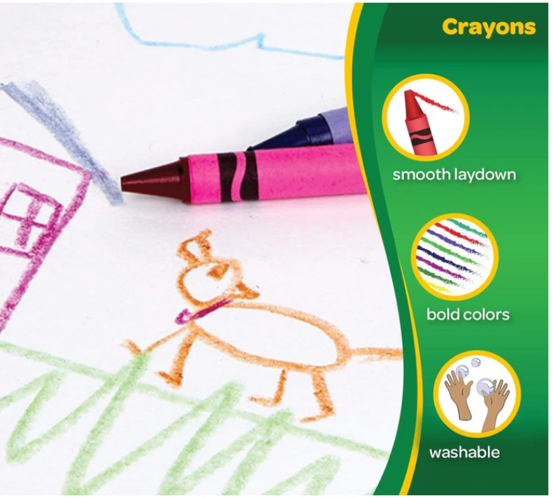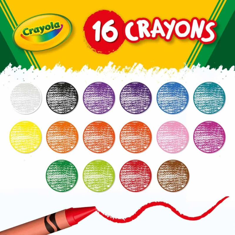 16 UND. Los crayones Crayola son la herramienta artística clásica para niños. Son los colores con los que han crecido generaciones. Los crayones Crayola están diseñados centrándose en el color verdadero, la suavidad y la durabilidad. Haga fluir esos jugos creativos con estos 16 colores clásicos: negro, azul, azul verde, azul violeta, marrón, rosa clavel, verde, naranja, rojo, rojo naranja, rojo violeta, violeta (púrpura), blanco, amarillo, amarillo verde. y amarillo anaranjado.