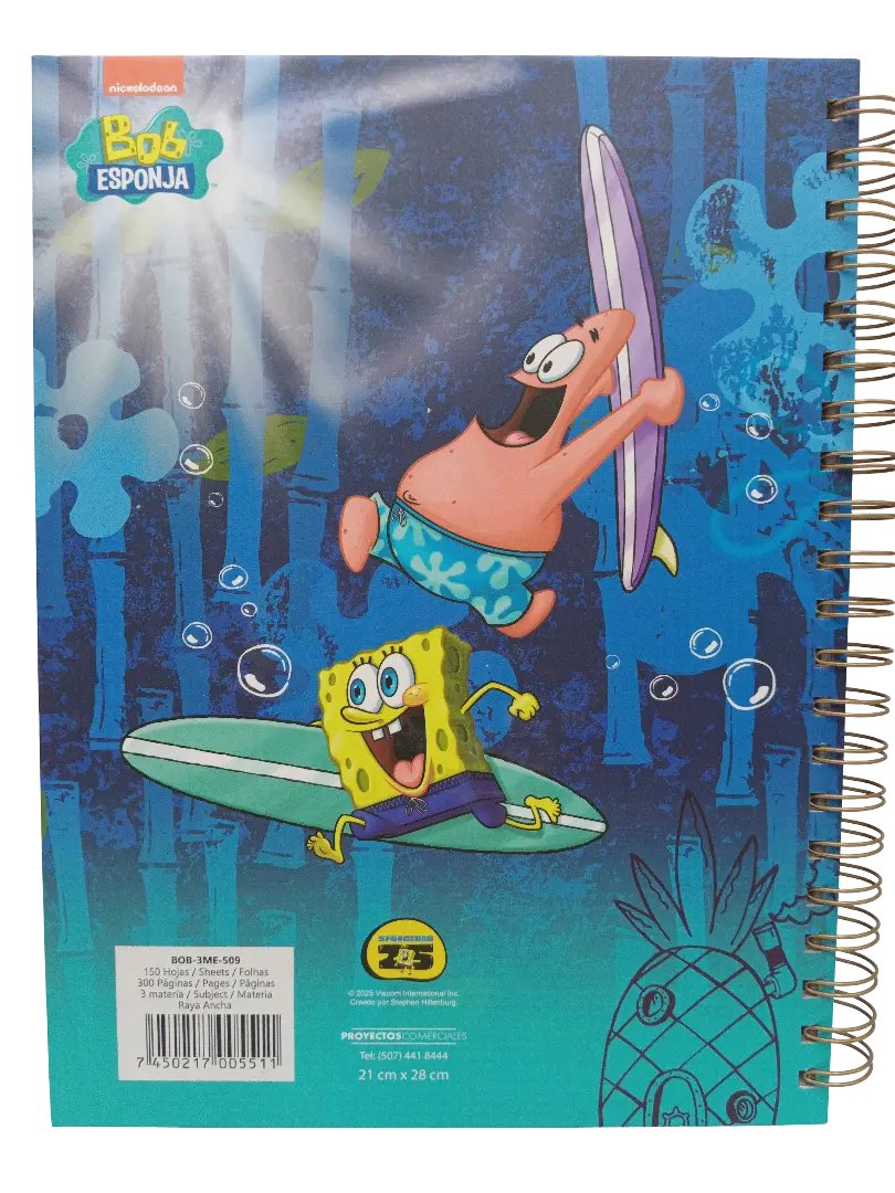 Cuaderno #3 3 Materias Licencia Bob Esponja Doble Anillo 300 Pag