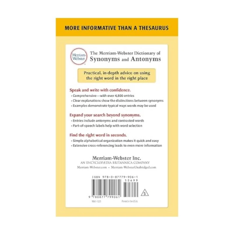 Hable y escriba con confianza con The Merriam-Webster Dictionary of Synonyms and Antonyms, una guía conveniente que lo ayuda a usar la palabra correcta en el lugar correcto.