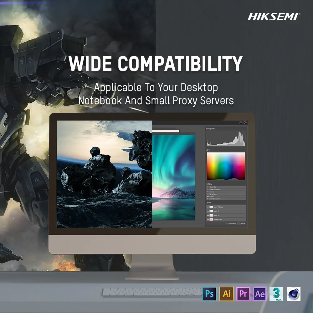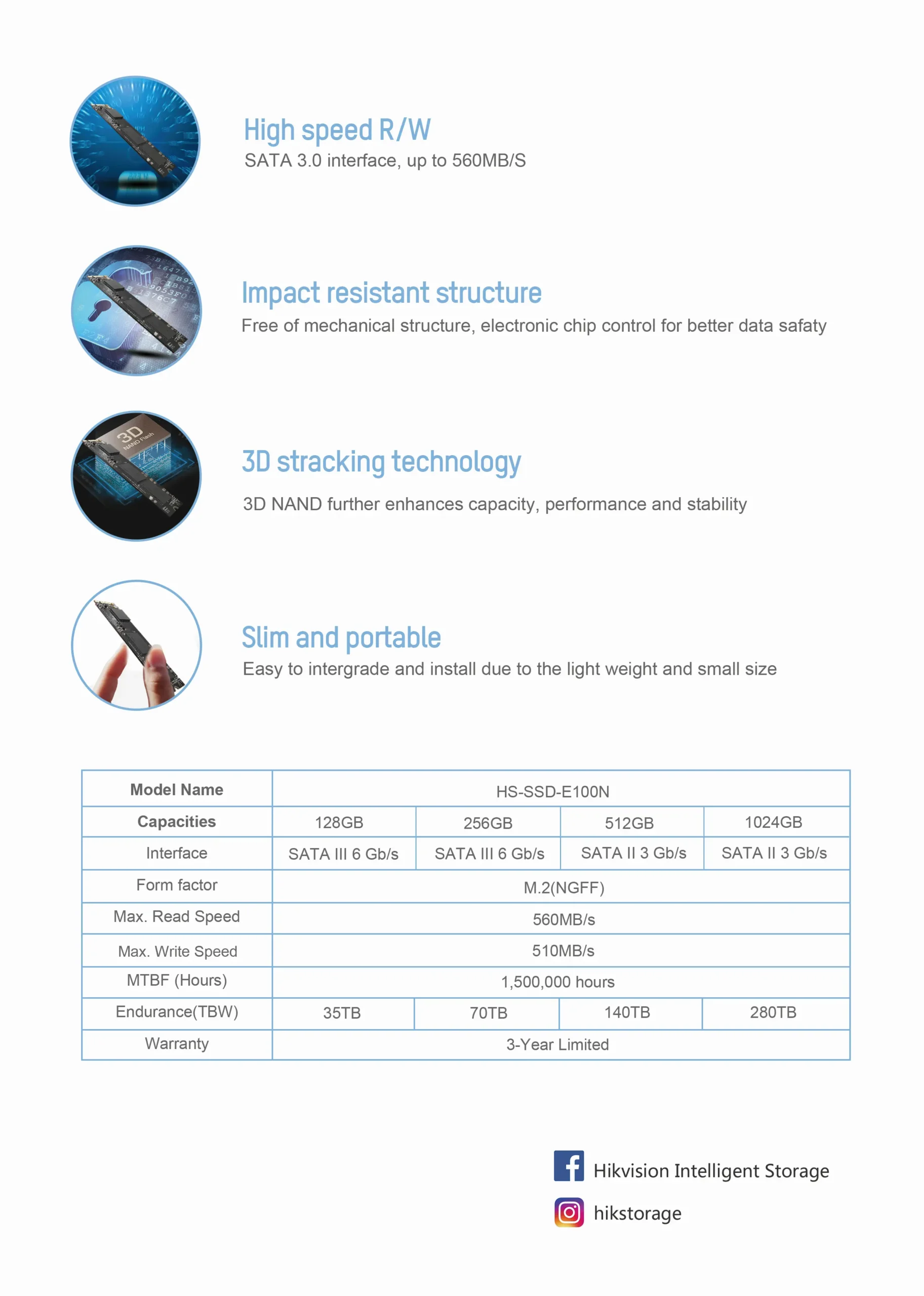 El HS-SSD-E100N cuenta con un controlador M.2 (NGFF) ATA-8 ACS2 Serial ATA 2.6 y es compatible con un amplio rango de temperaturas de operación (0℃ ~ 70℃) y humedad (8% ~ 95%, no condensada). Con un peso de tan solo 5.4g, este SSD es ligero y fácil de instalar en su sistema.