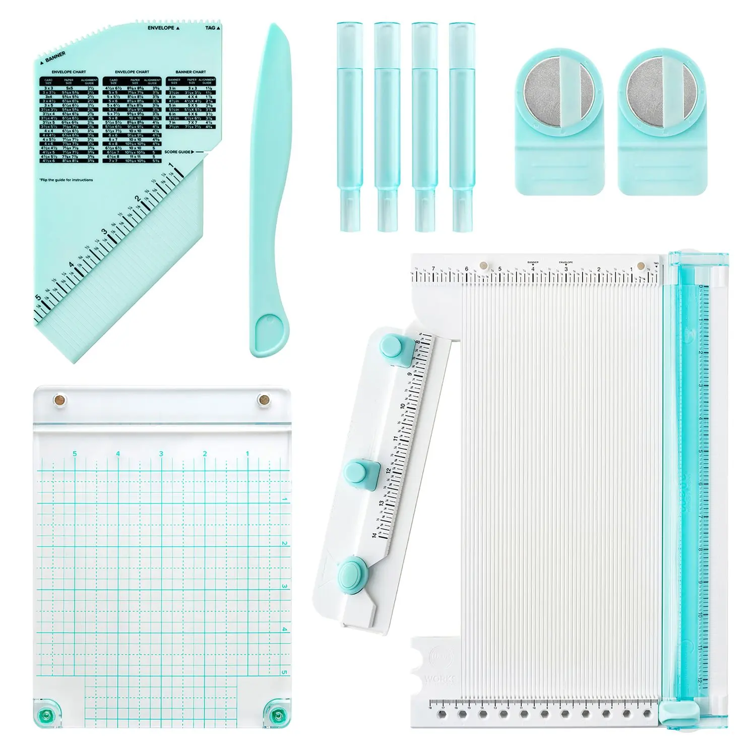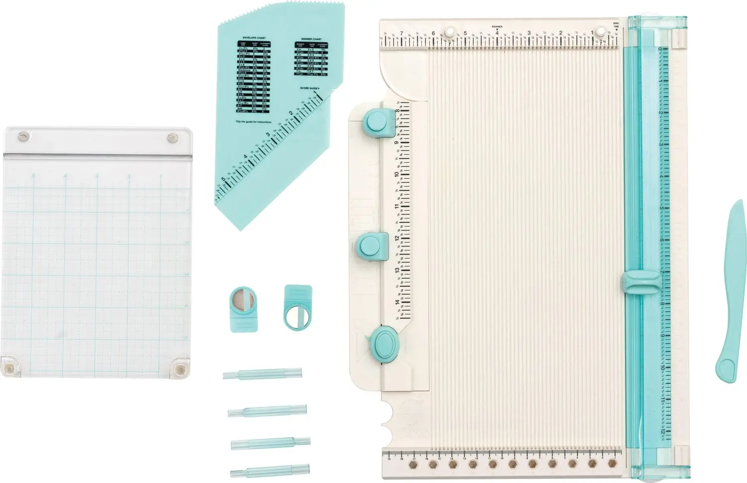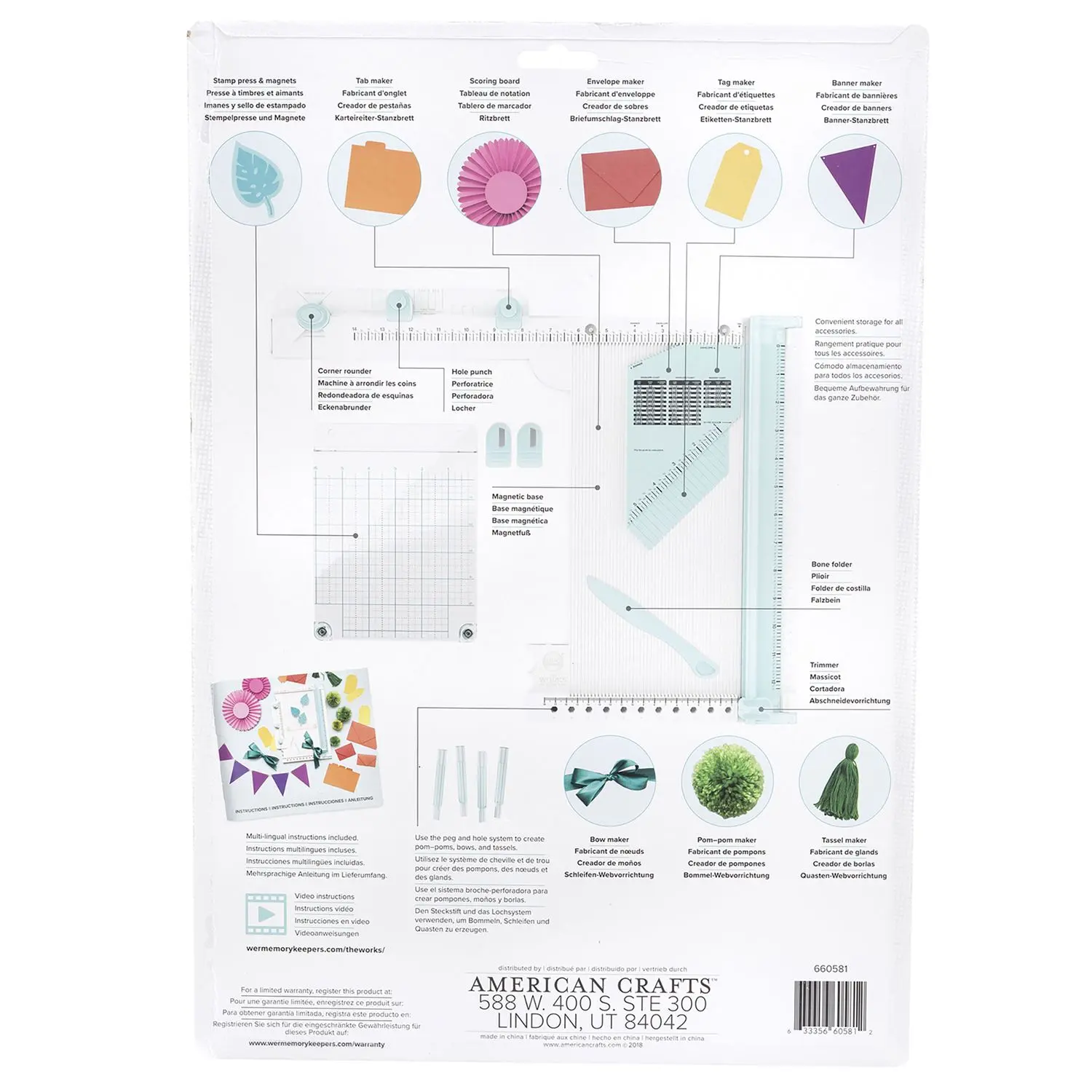 ¡Combina más de una docena de herramientas imprescindibles en un diseño práctico! Perfecto para recortar, marcar, pancartas, sobres, pestañas, etiquetas, pompones, borlas, lazos, estampados y más. Almacenamiento práctico para todos los accesorios. Este paquete de 12 x 17 pulgadas contiene una recortadora, una plegadora de huesos, una máquina para hacer pancartas, una para hacer etiquetas, una para hacer sobres, una tabla de puntuación, una para marcar pestañas, una prensa para sellos e imanes, una redondeadora de esquinas, una perforadora, una base magnética y un manual. Importado.