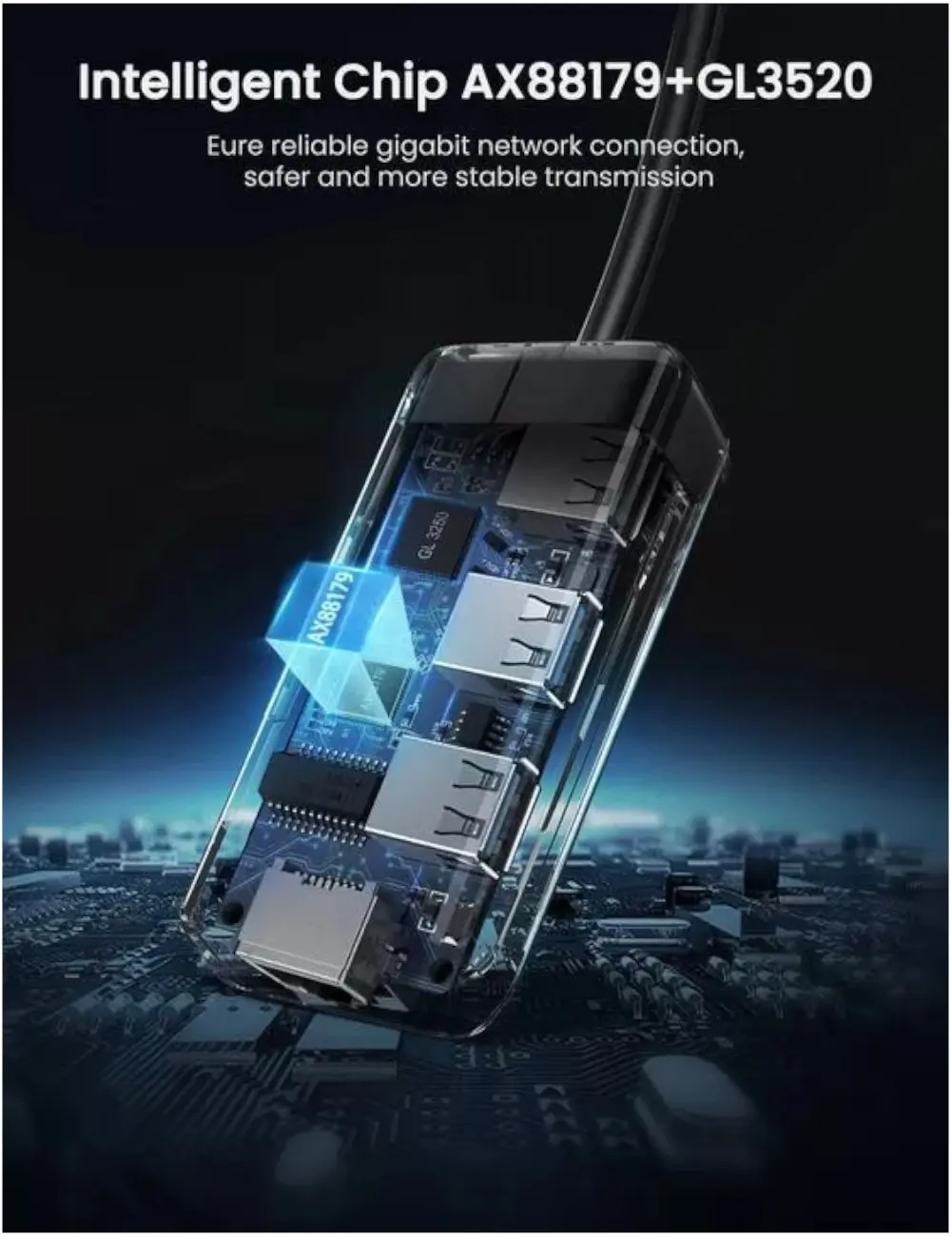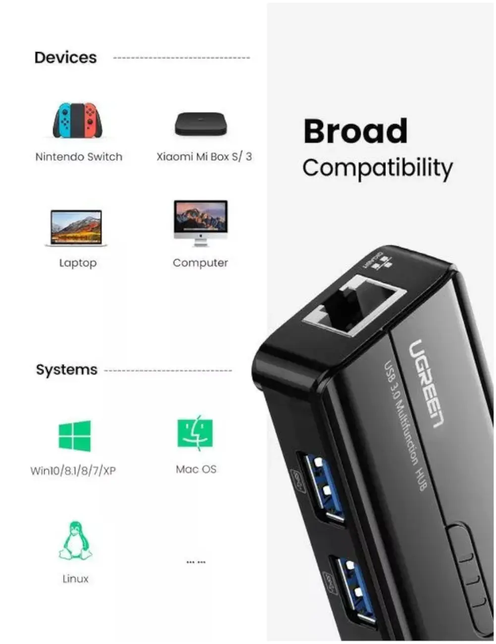 Concentrador Ethernet USB 3.0 5 en 1: el adaptador USB a Ethernet UGREEN está equipado con un puerto Ethernet Gigabit y 3 puertos USB 3.0. Mientras proporciona a su dispositivo una red cableada estable, también es posible expandir más accesorios. También está equipado con un puerto de fuente de alimentación de CC de 5 V para que pueda utilizar algunos dispositivos de alta potencia. (Nota: el adaptador de corriente DC 5v2a no está incluido).