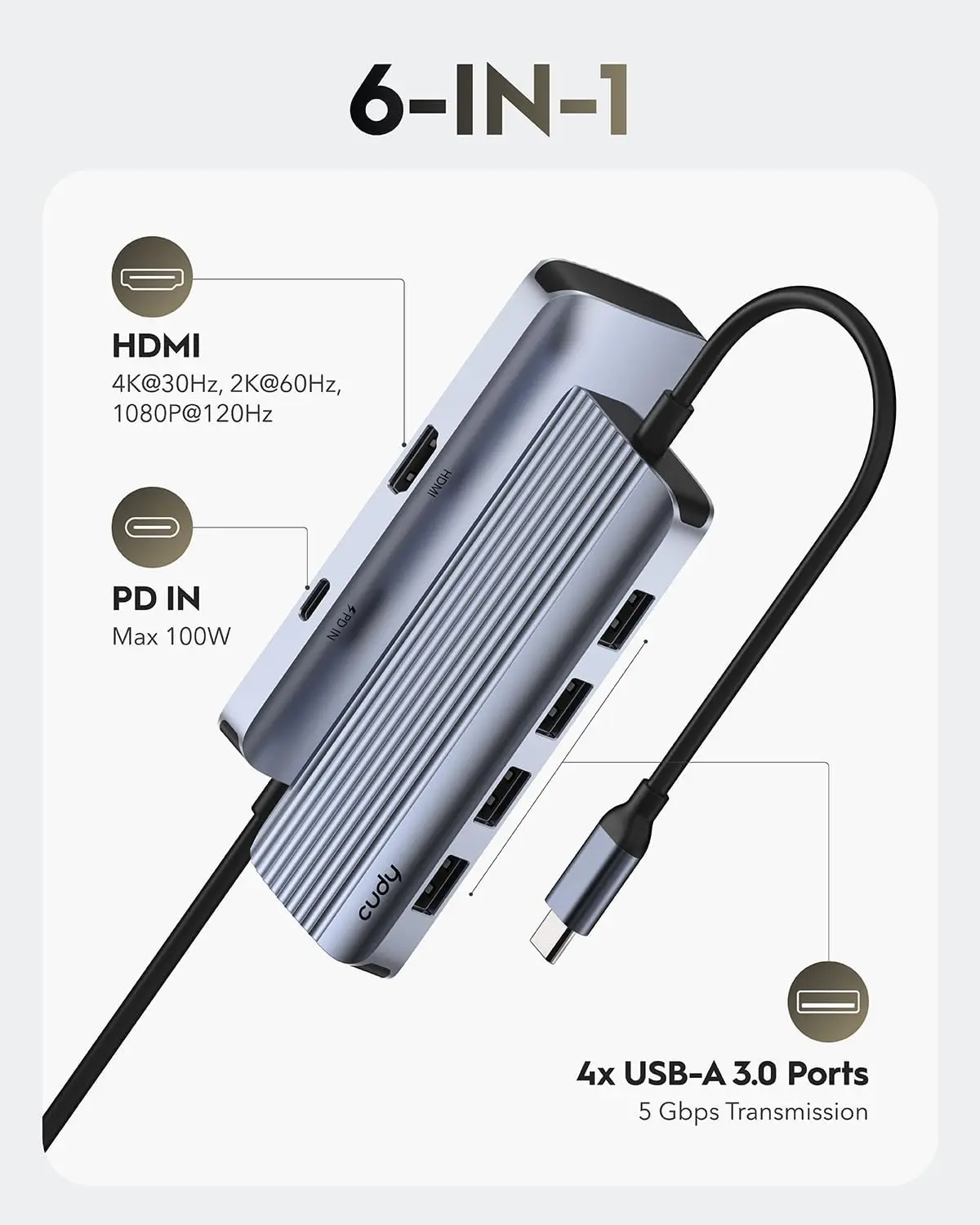 Hub Usb-C 6 Puertos Uh500 Plata Cudy