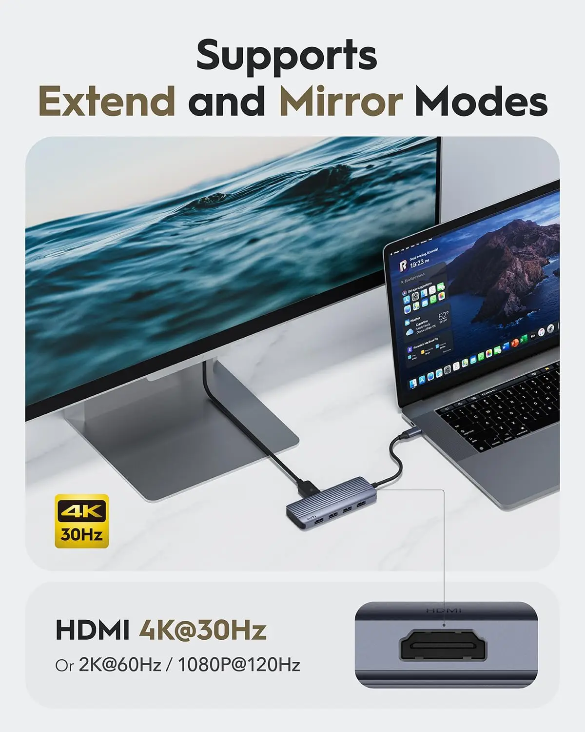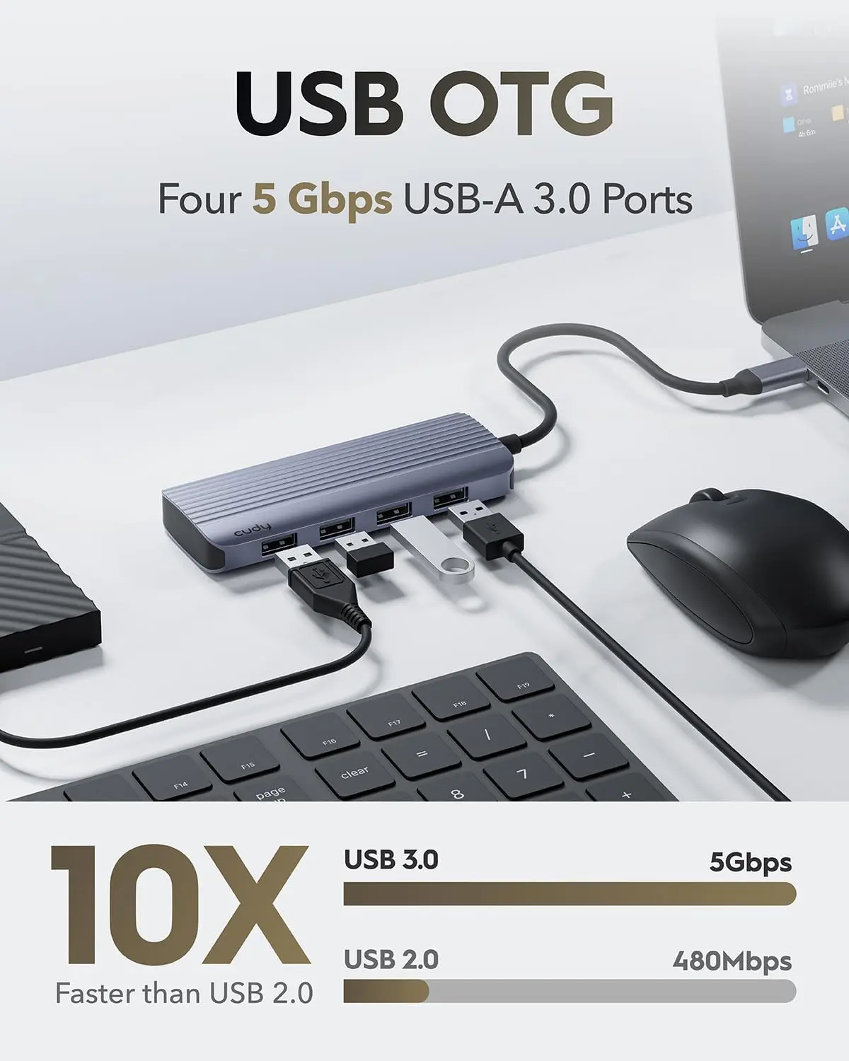 Hub USB-C Plug-and-Play para ampliar un puerto USB-C a HDMI y cuatro puertos USB-A, ideal para gente de negocios, profesores y estudiantes escolares.