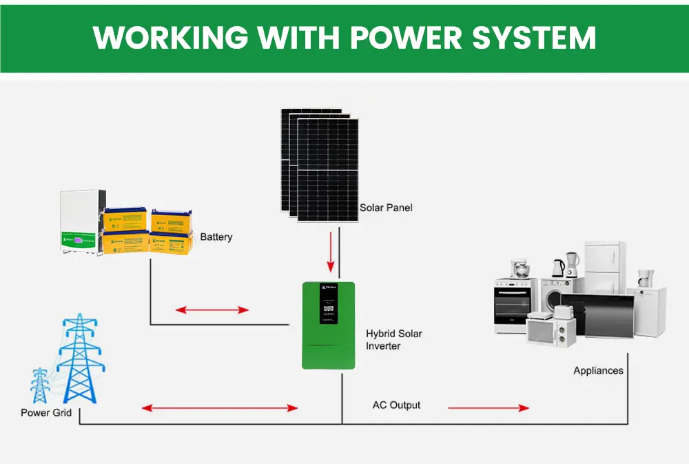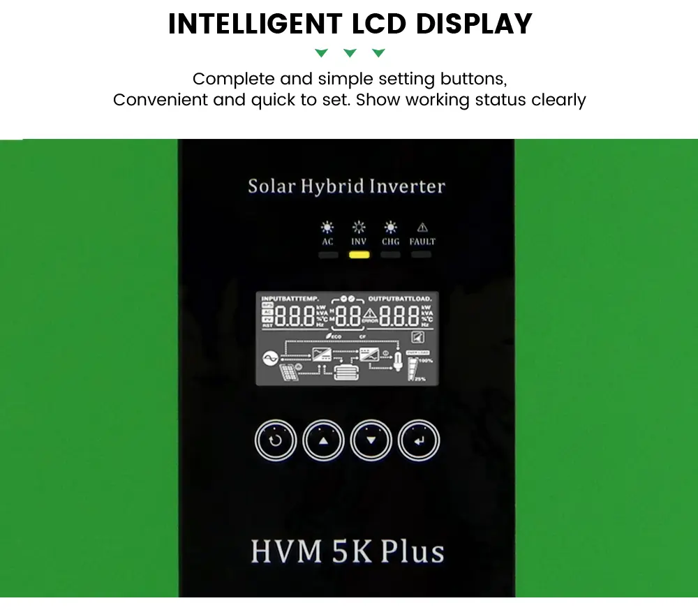 Este es un inversor solar híbrido multifuncional, función de combinación del inversor, Cargador solar y cargador de batería para ofrecer soporte de energía ininterrumpida en tamaño portátil. Su completa pantalla LCD ofrece un funcionamiento de botones configurable por el usuario y de fácil acceso, como la corriente de carga de la batería., Prioridad del cargador AC/solar, y base de voltaje de entrada aceptable en diferentes aplicaciones.