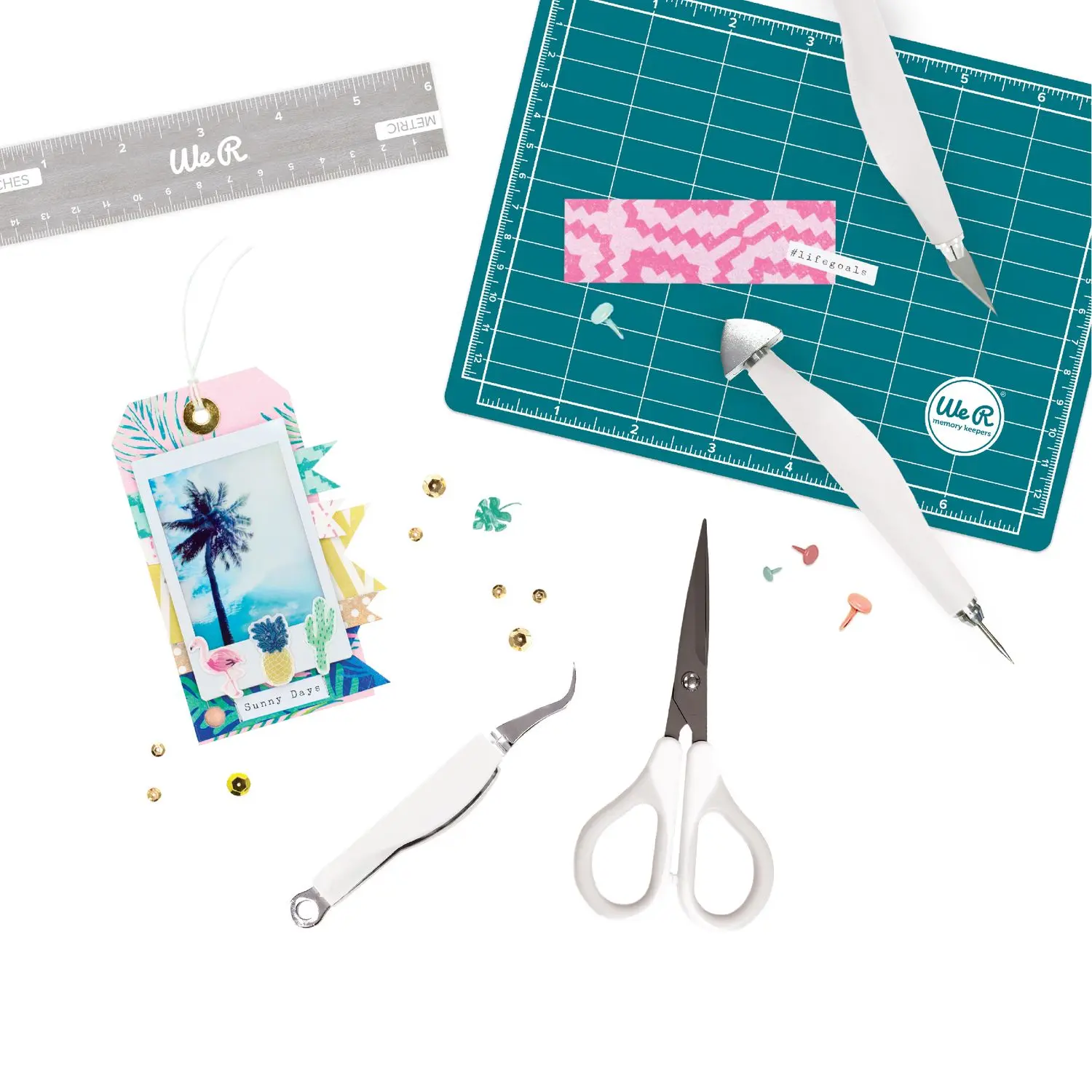 Este mini kit de herramientas es perfecto para todos los artesanos del papel. Cuenta con una variedad de las herramientas más esenciales que los creadores de álbumes de recortes y tarjetas buscan continuamente. Este kit contiene un tapete magnético de 6×8 pulgadas, una regla magnética de 6 pulgadas, un par de tijeras, un par de pinzas de acción inversa, una cuchilla para arte y una herramienta para perforar y clavar. Importado. ADVERTENCIA: Este producto puede exponerlo a sustancias químicas que el estado de California considera causantes de cáncer y defectos de nacimiento u otros daños reproductivos. www.p65warnings.ca.gov.