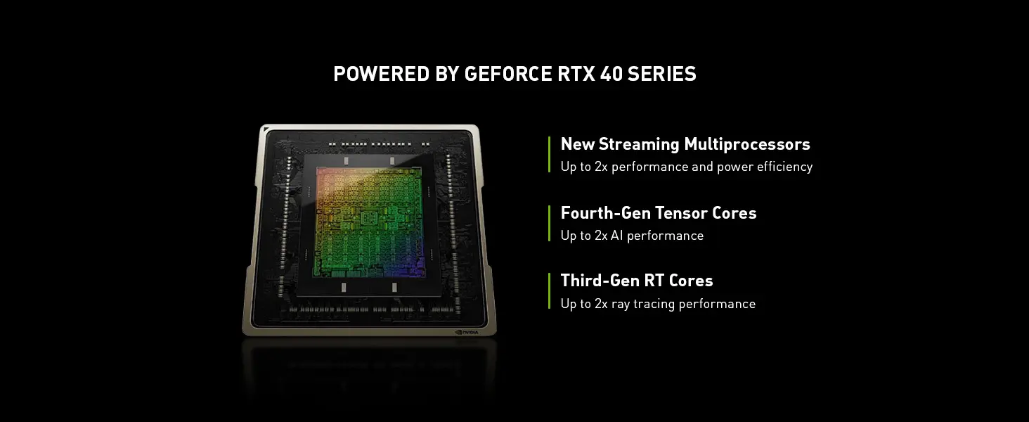GPU para portátiles NVIDIA GeForce RTX serie 40: increíblemente rápidas con DLSS 3 mejorado por IA, trazado de rayos realista y tecnología Max-Q para máxima eficiencia.
