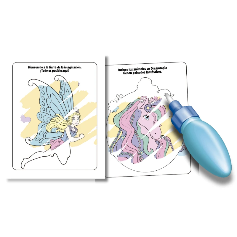 ¡Pintura sin desorden para niños! Este libro de colorear con agua tiene cuatro páginas reutilizables y un bolígrafo recargable. Usa el bolígrafo para revelar colores y detalles ocultos en cada escena.