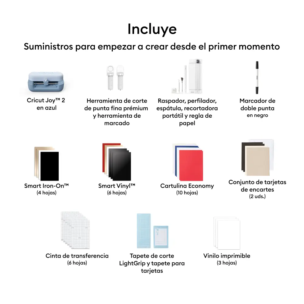 - Agrupar y guardar: Comience a fabricar nada más sacarlo de la caja con suministros imprescindibles como Smart Vinyl™ y Smart Iron-On™ para crear hasta 35 proyectos.¹
