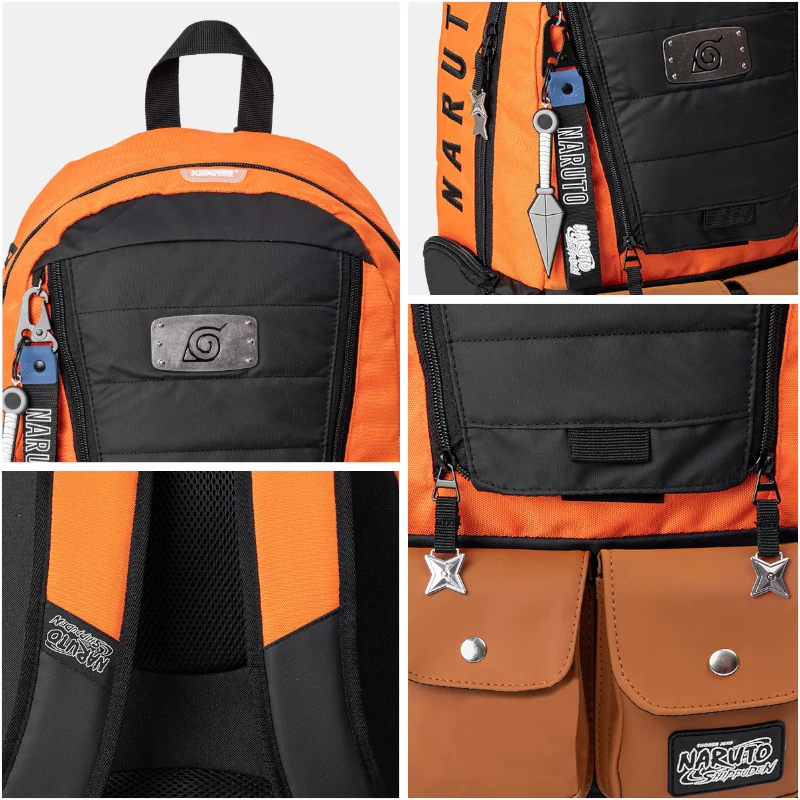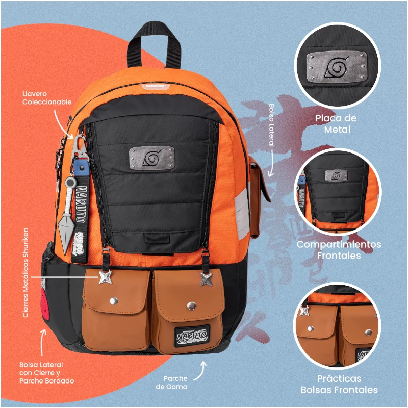 Los elementos oficiales que no te puedes perder son… sus cierres en forma de shuriken, el llavero coleccionable en forma de Kunai, sus bolsillos iconicos, la placa metalica de Konoha y todos sus materiales premuim que la hacen ser una mochila de alta calidad.