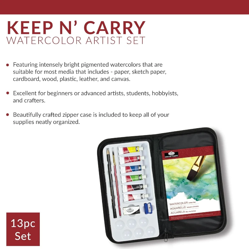 - Incluye 6 tubos de pintura de acuarela (5 ml), 2 pinceles de taklon, 1 lápiz de grafito, 1 borrador blanco, 1 sacapuntas, 1 bloc de acuarela y 1 estuche de transporte con cremallera.