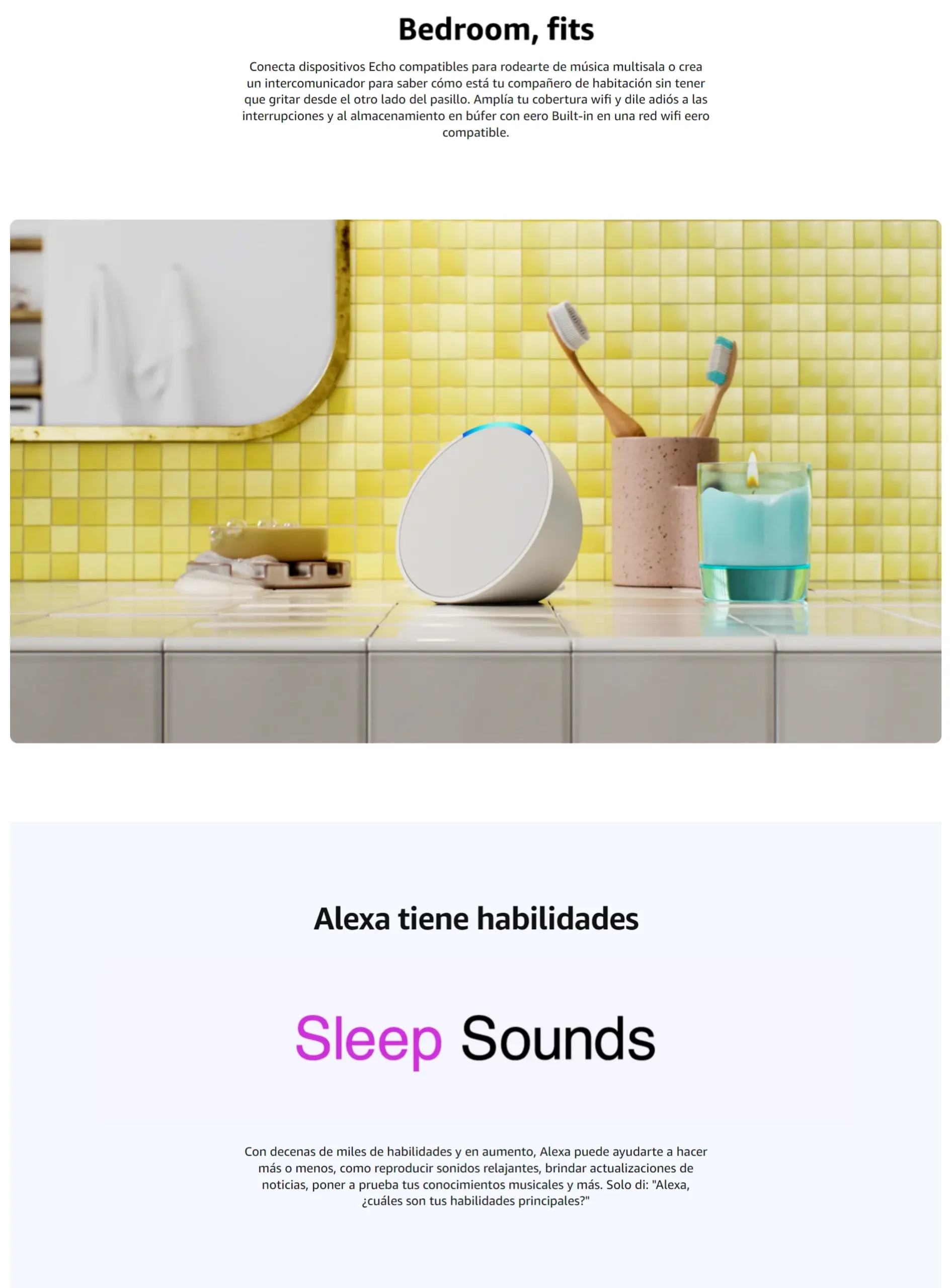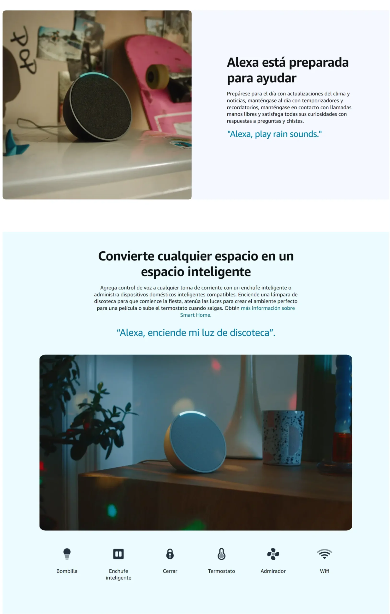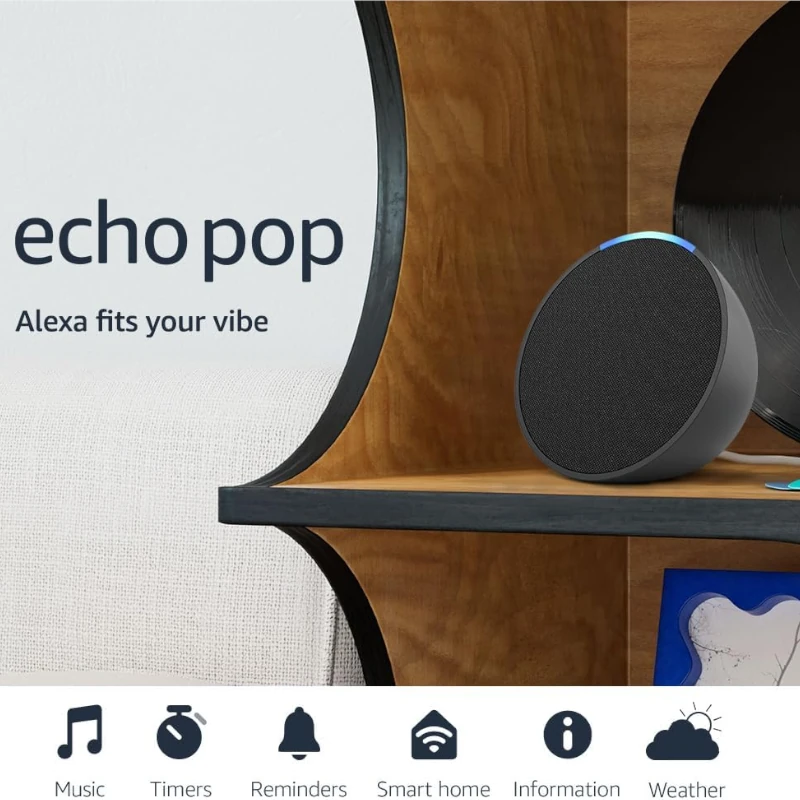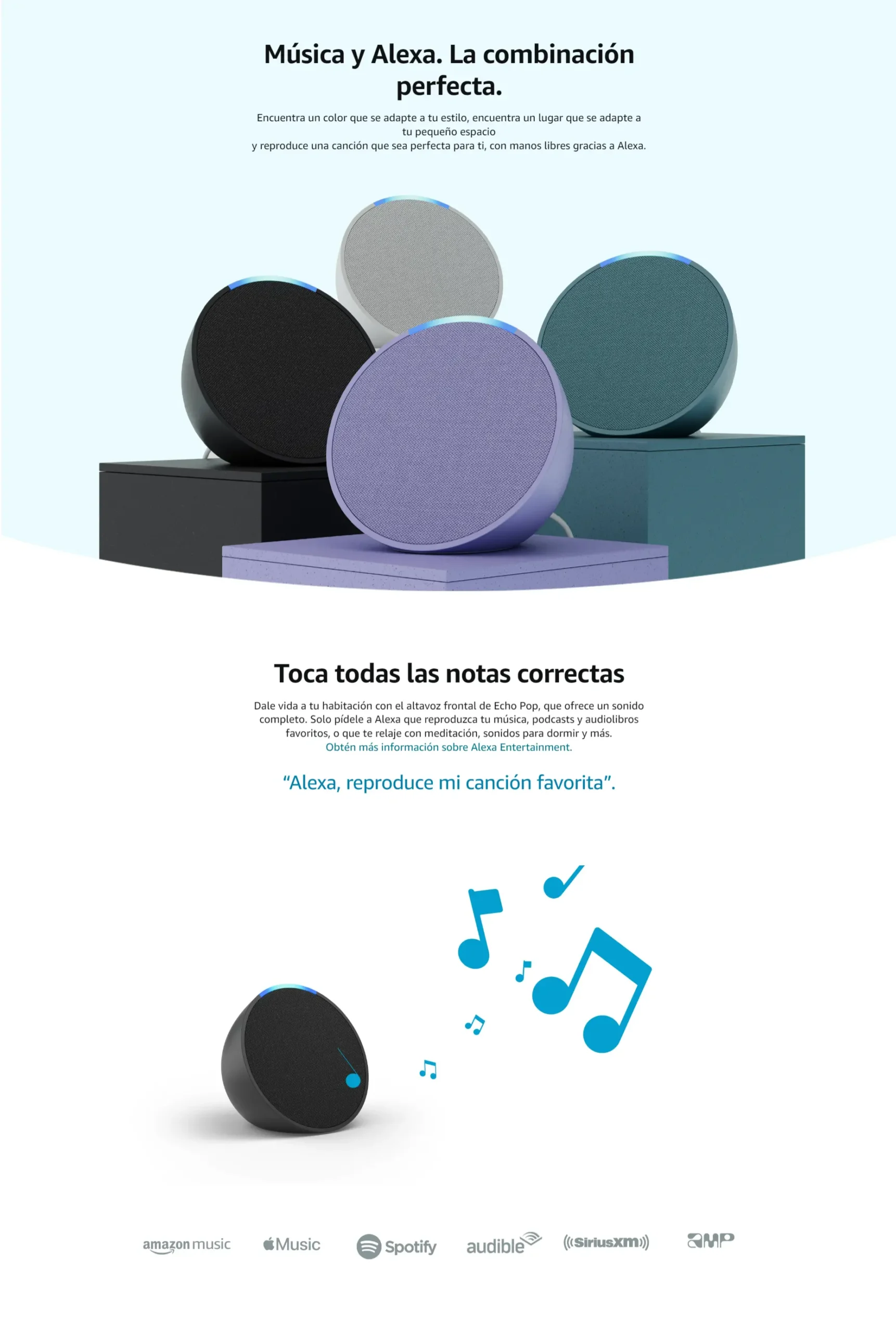 Echo Pop: este altavoz inteligente compacto con Alexa ofrece un sonido completo que es ideal para habitaciones y espacios pequeños. Es lo suficientemente pequeño para integrarse y lo suficientemente potente para destacarse.