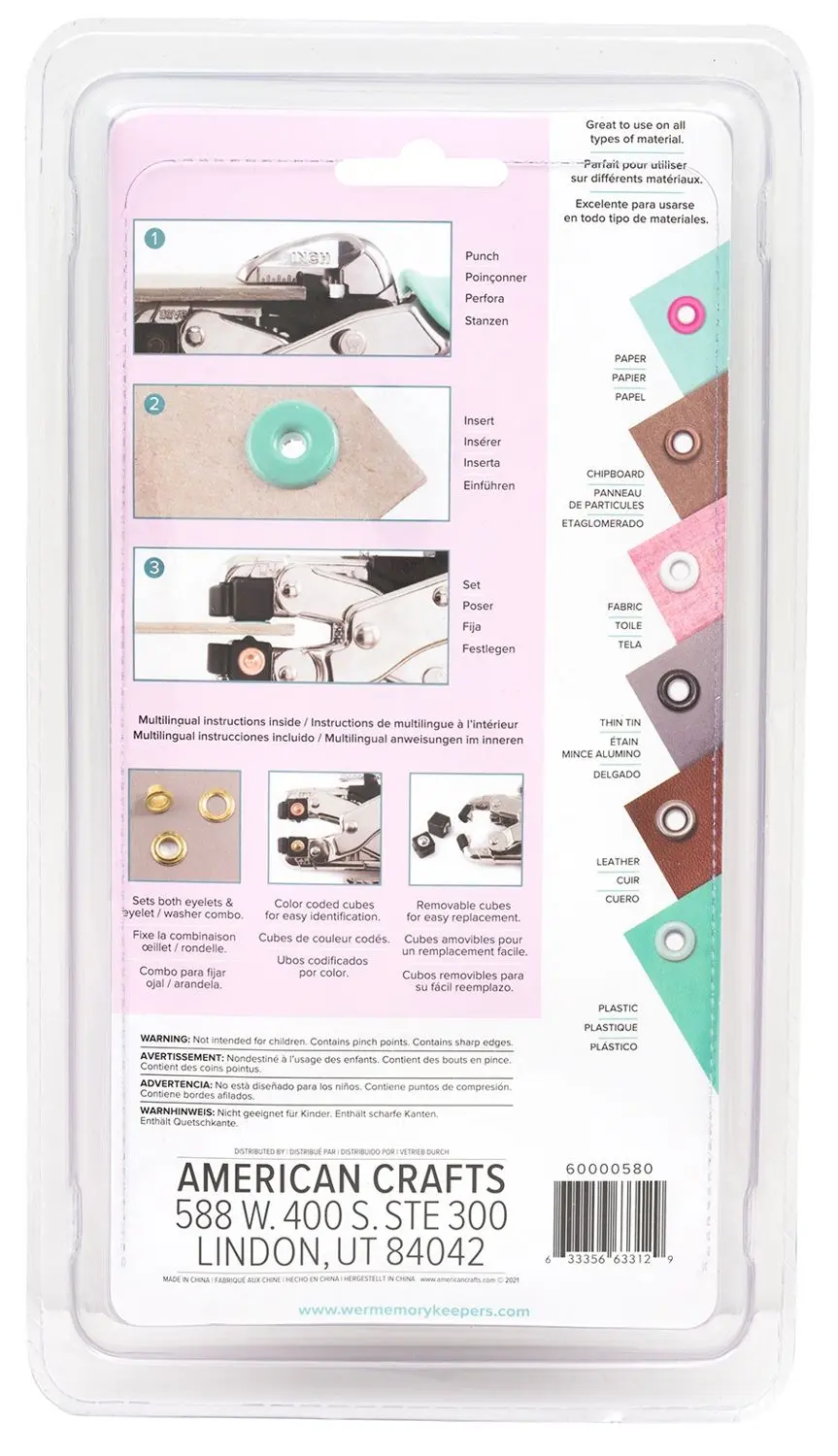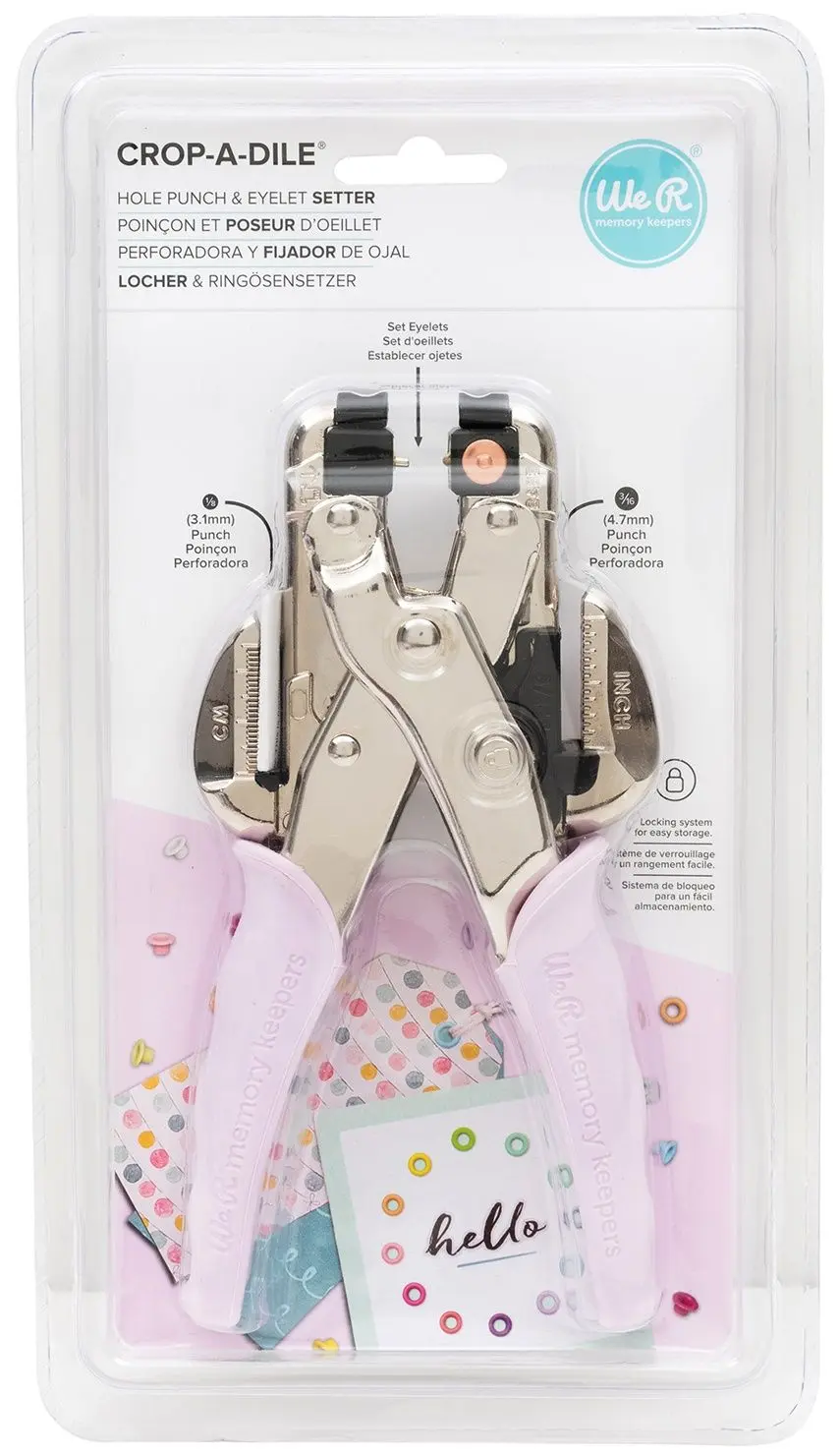 Colocador de ojales y perforadora Crop-A-Dile con asas lilas. Sin hacer clic, golpear, golpear, girar o gruñir. Esta herramienta todo en uno perfora y fija ojales, broches y mucho más. Perfora fácilmente cualquier material: grueso o fino: papel, cuero, plástico, metal, aglomerado, acrílico, tela, madera y mucho más, coloca silenciosa y suavemente ojales de 1/8″ y 3/16″. Medidas del punzón: 8×3,5×1 pulgadas. Este paquete contiene un We R Memory Keepers Crop-A-Dile, Lila. Importado.