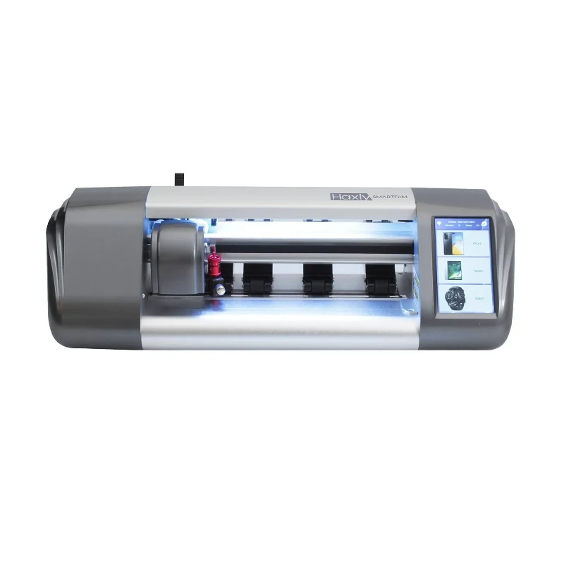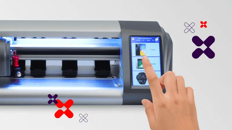 Operarlo es extremadamente sencillo. Le colocas una lámina de SmartFilm, seleccionas un modelo de smartphone o smartwatch, y Wibo realiza el corte de manera completamente automática en poco más de 30 segundos.