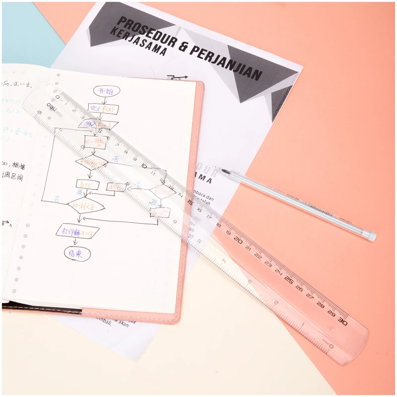 - Regla de plástico transparente de 30 cm, ideal para mediciones exactas en proyectos escolares y de oficina.