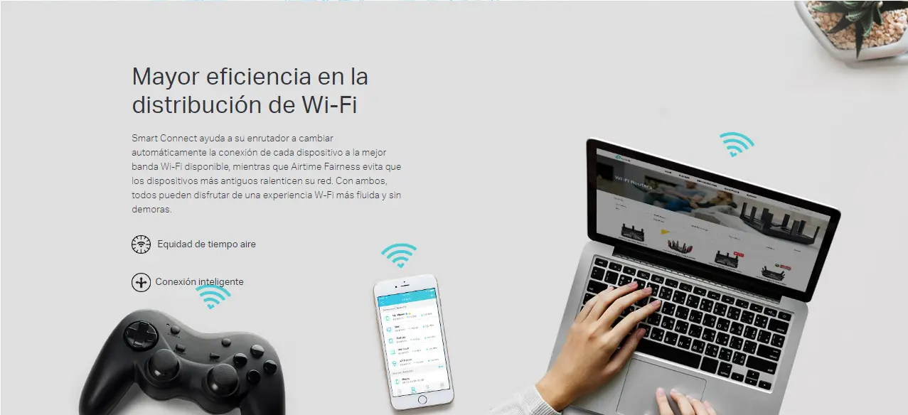 - Función Smart Connect. El router cambia automáticamente la conexión de cada dispositivo a la mejor banda Wi-Fi disponible.