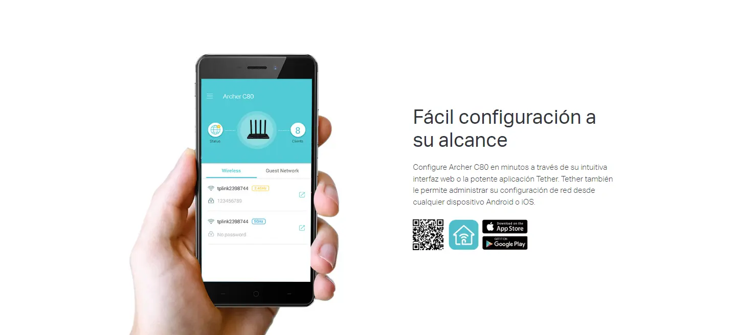 - Fácil instalación y uso. Configura en pocos minutos tu router Archer C80 cómodamente desde la App Tether