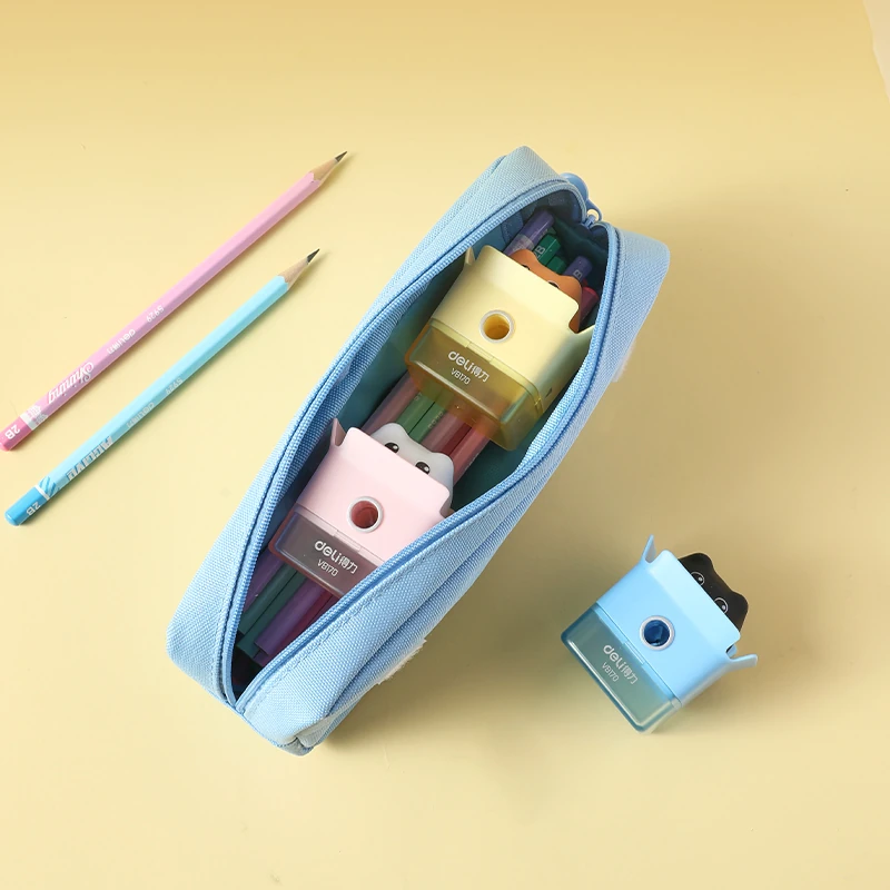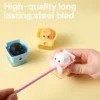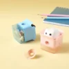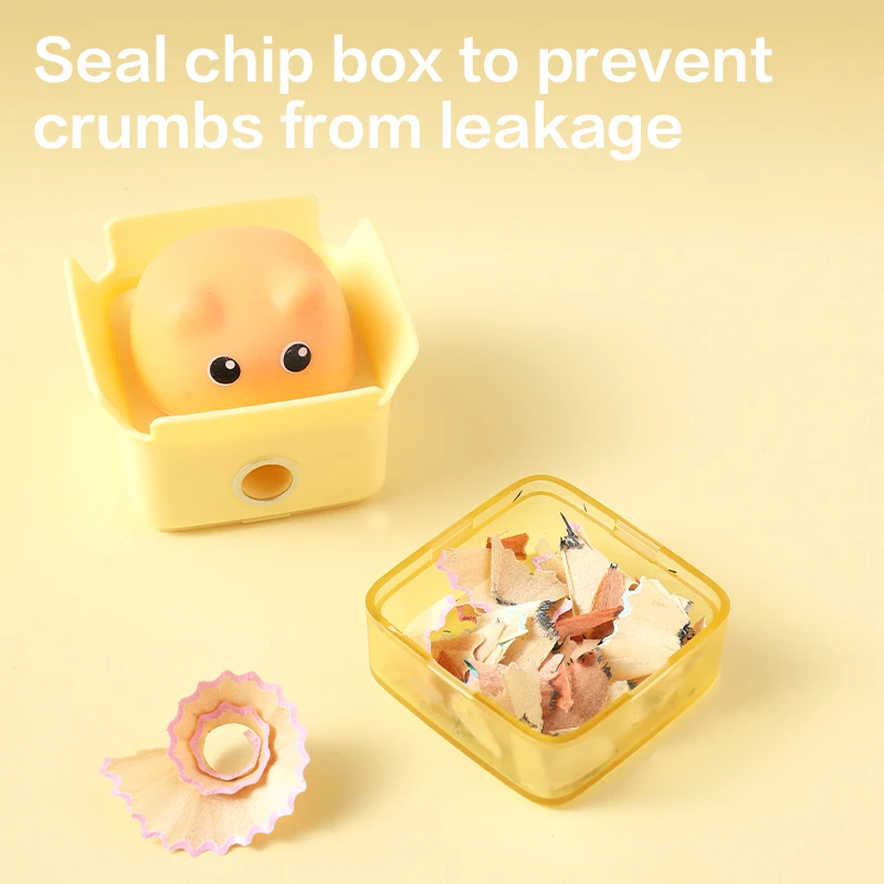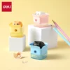 Sacapuntas práctico y divertido, con depósito sellado que evita derrames. Ideal para uso escolar diario.