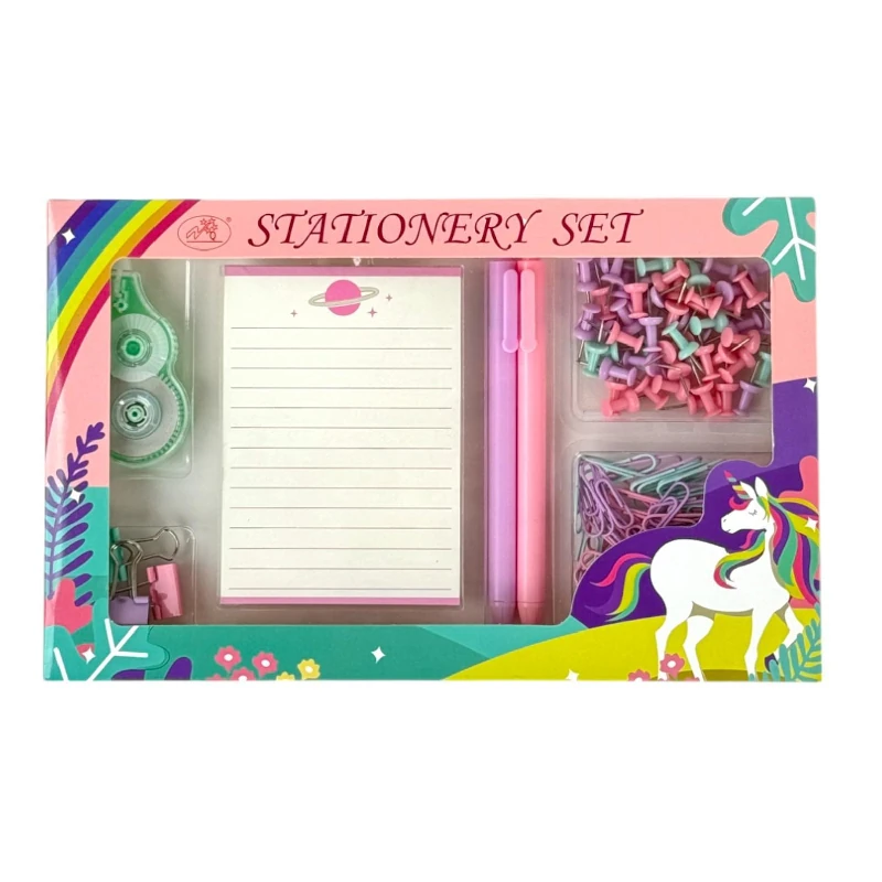 ¡Organiza tu escritorio con estilo mágico! ✨ Este set escolar incluye clips, chinches, bloc de notas, bolígrafos y cinta decorativa en colores surtidos, todo con diseño de unicornio.