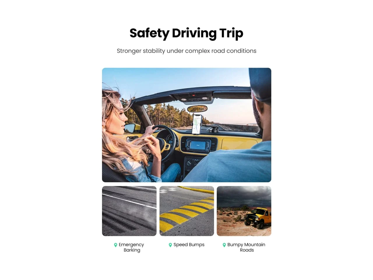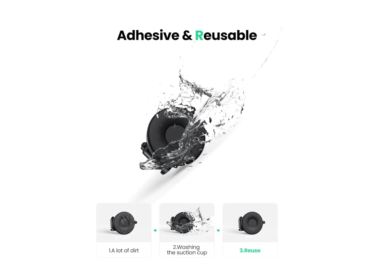 La ventosa lavable se adhiere de forma segura a su tablero o parabrisas, incluso en una carretera con baches.