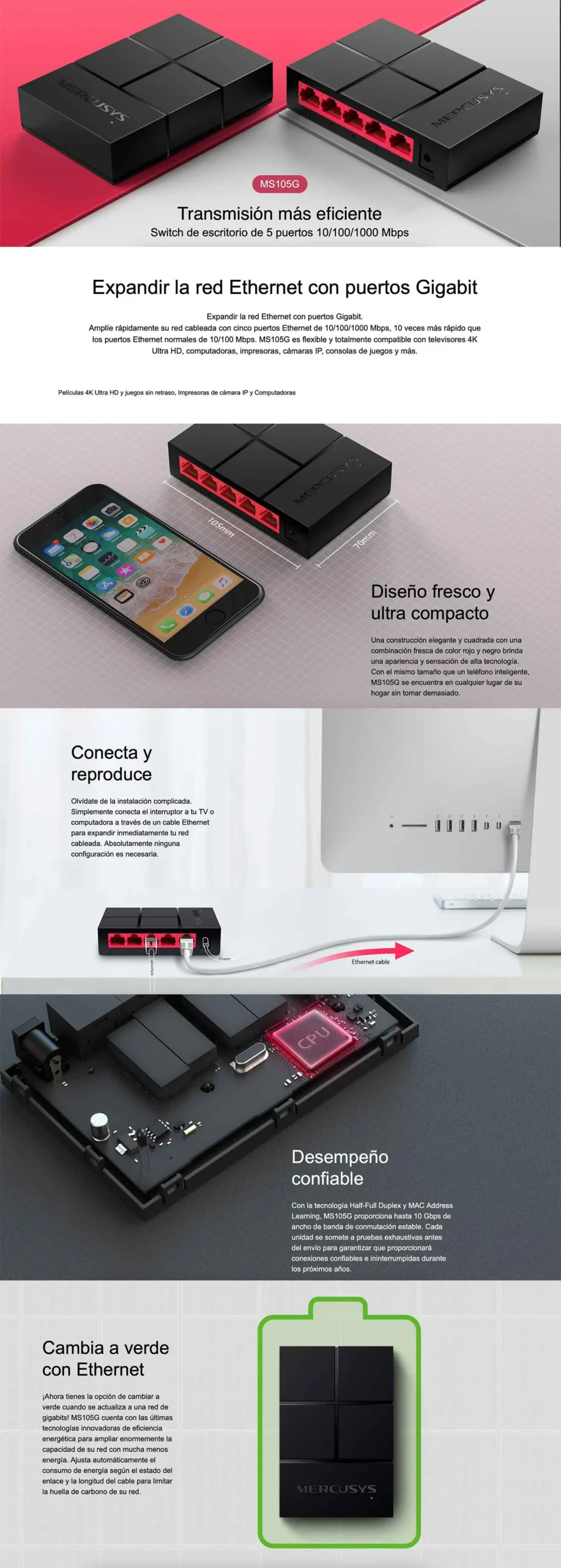Switch 5 Puertos 10/100/1000 Mbps Mercusys P/Escritorio Ms105g