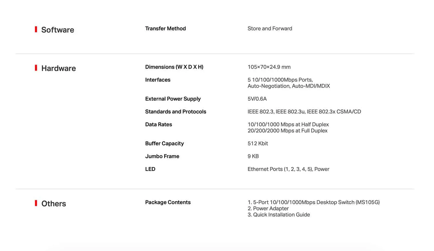- Cinco puertos RJ45 de autonegociación de 10/100 / 1,000 Mbps con MDI / MDIX automático admitidos