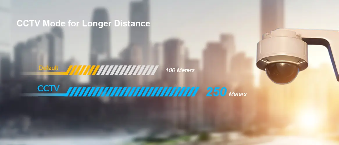 • Conmutador de modo CCTV/VLAN, alimentación remota y datos a 250 m
