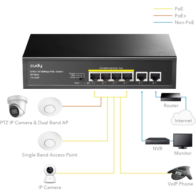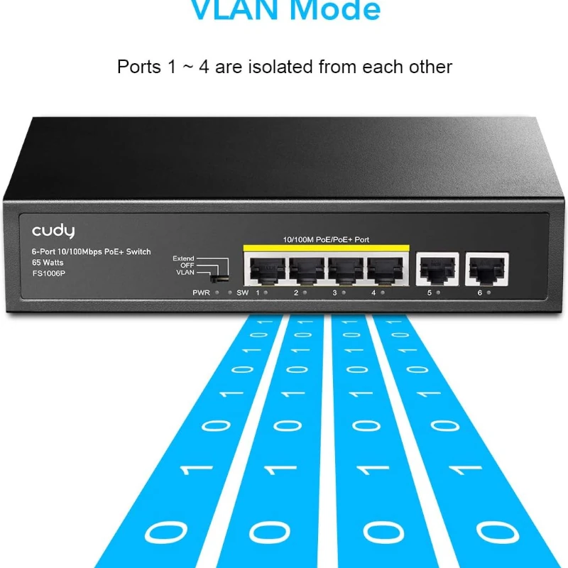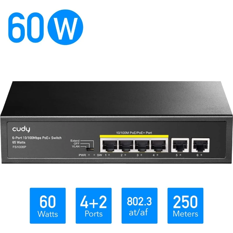 Switch 6 Puertos 10/100 Mbps C/Poe+4 Puertos Cudy P/Escritorio Fs1006P