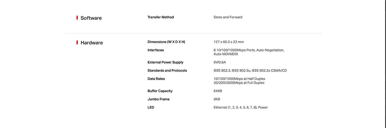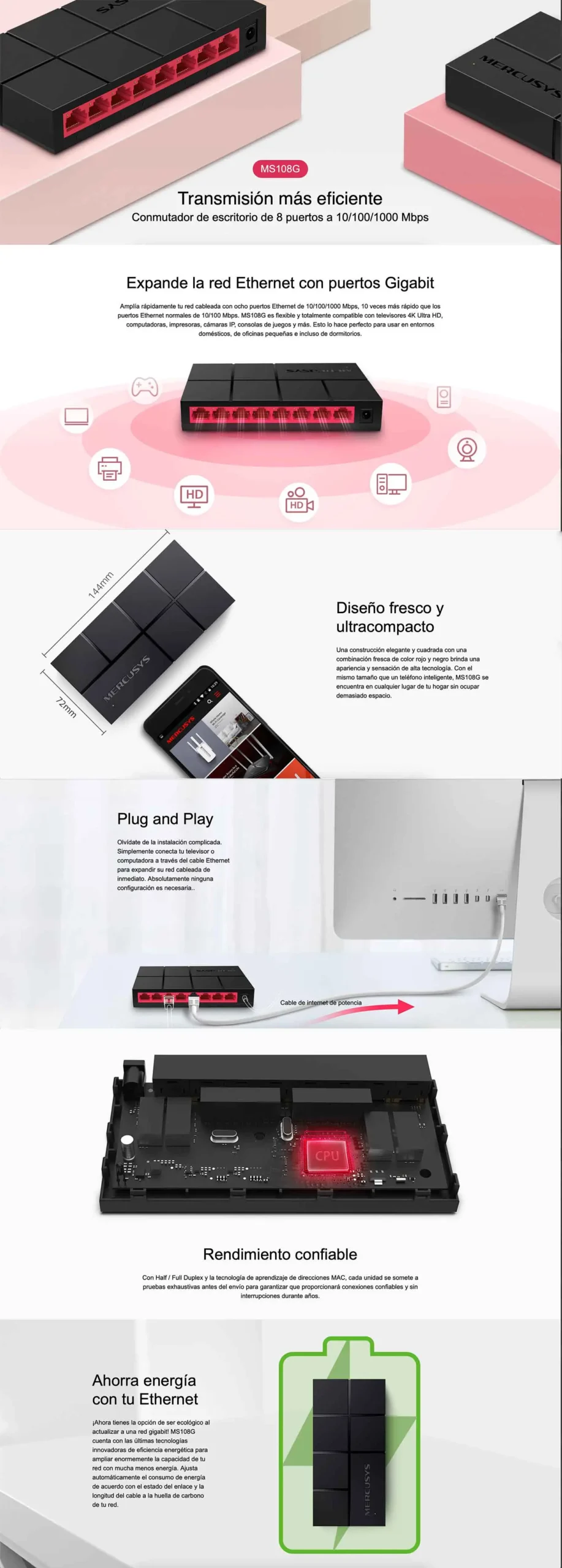 - Ochopuertos RJ45 10/100/1000Mbps con auto negociación y con soporte MDI/MDIX