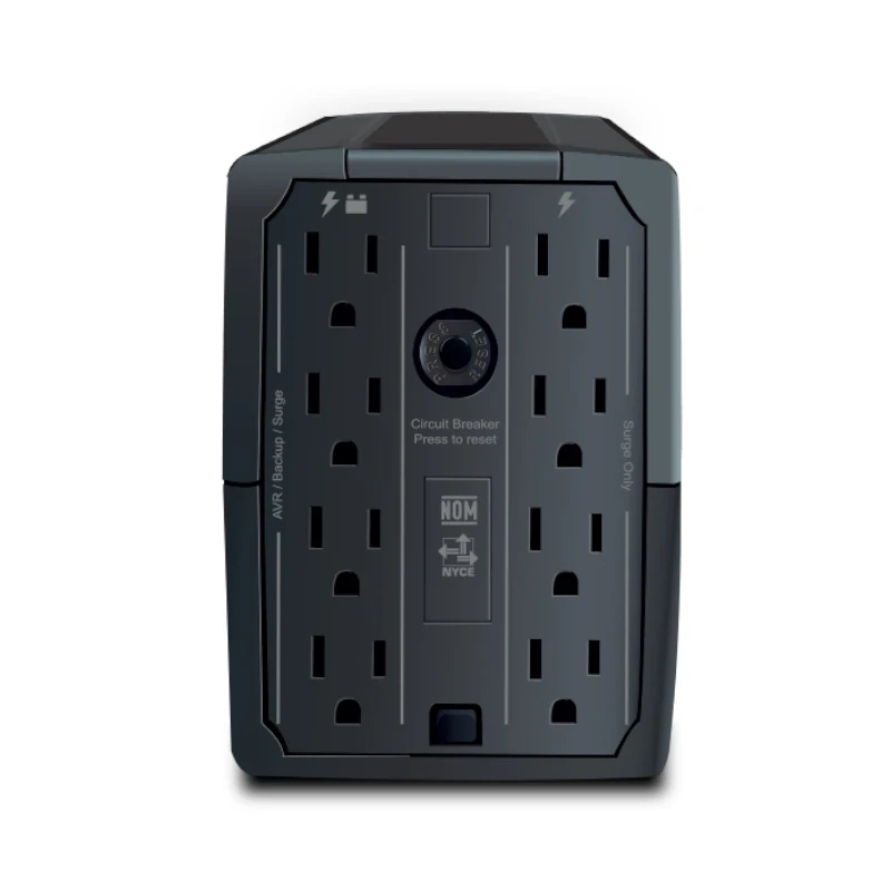 UPS interactivo de línea de 1000VA con 8 toma corrientes NEMA 5-15 diseñados para el hogar / oficina. Baterías de plomo Acido selladas internas, regulador de voltaje supresor de sobre tensiones y salidas de derivación para cargas más grandes.