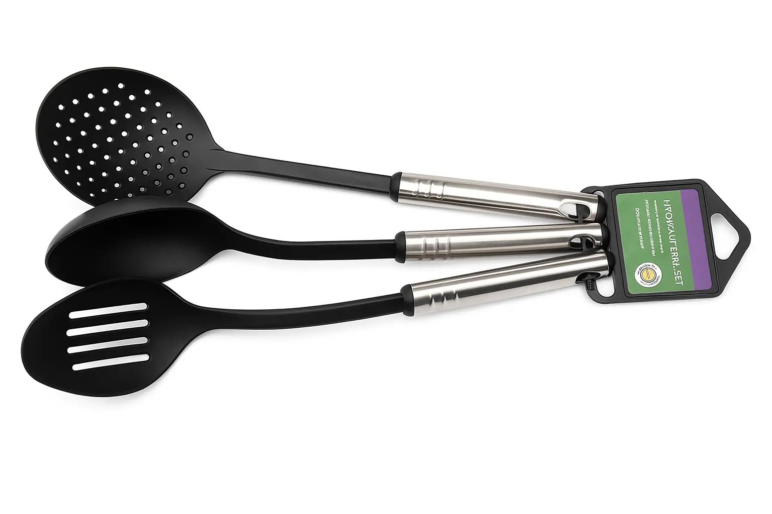 Set de utensilios plásticos con mango metálico, ideal para cocinar con estilo y comodidad. Resistentes al calor y perfectos para uso diario.