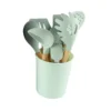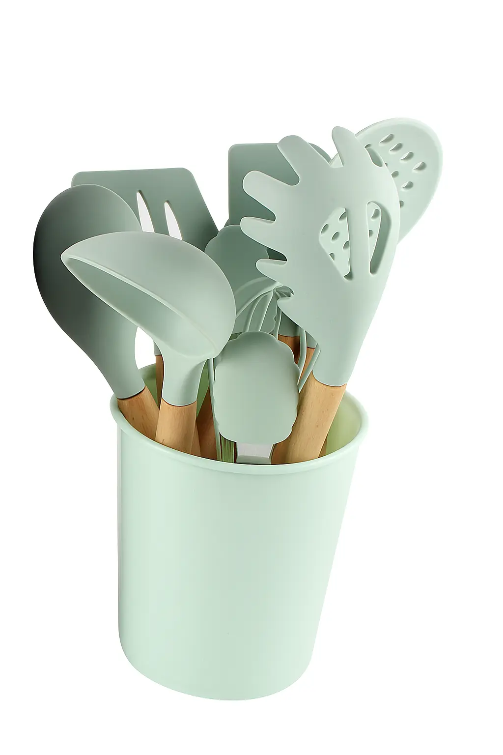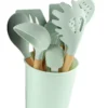 Elegante set de utensilios de cocina en color verde con mango de madera y base contenedora. Perfecto para cocinar y mantener todo organizado con estilo.