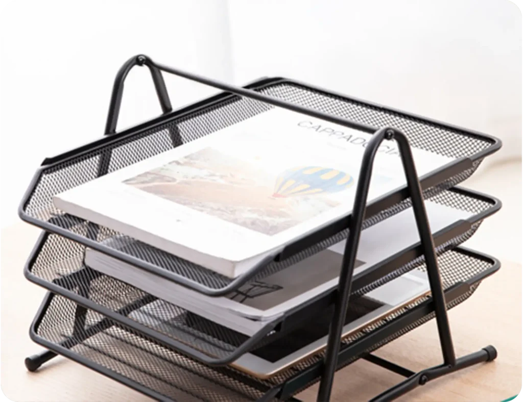 Los organizadores metálicos para escritorio son ideales para clasificar y tener a la mano bolígrafos, tijeras, notas adhesivas y otros accesorios de oficina. La papelera metálica ayuda a mantener tu espacio limpio y libre de papeles innecesarios, combinando funcionalidad y diseño. El folder plástico con clip es perfecto para almacenar y proteger documentos importantes sin que se pierdan o arruguen.