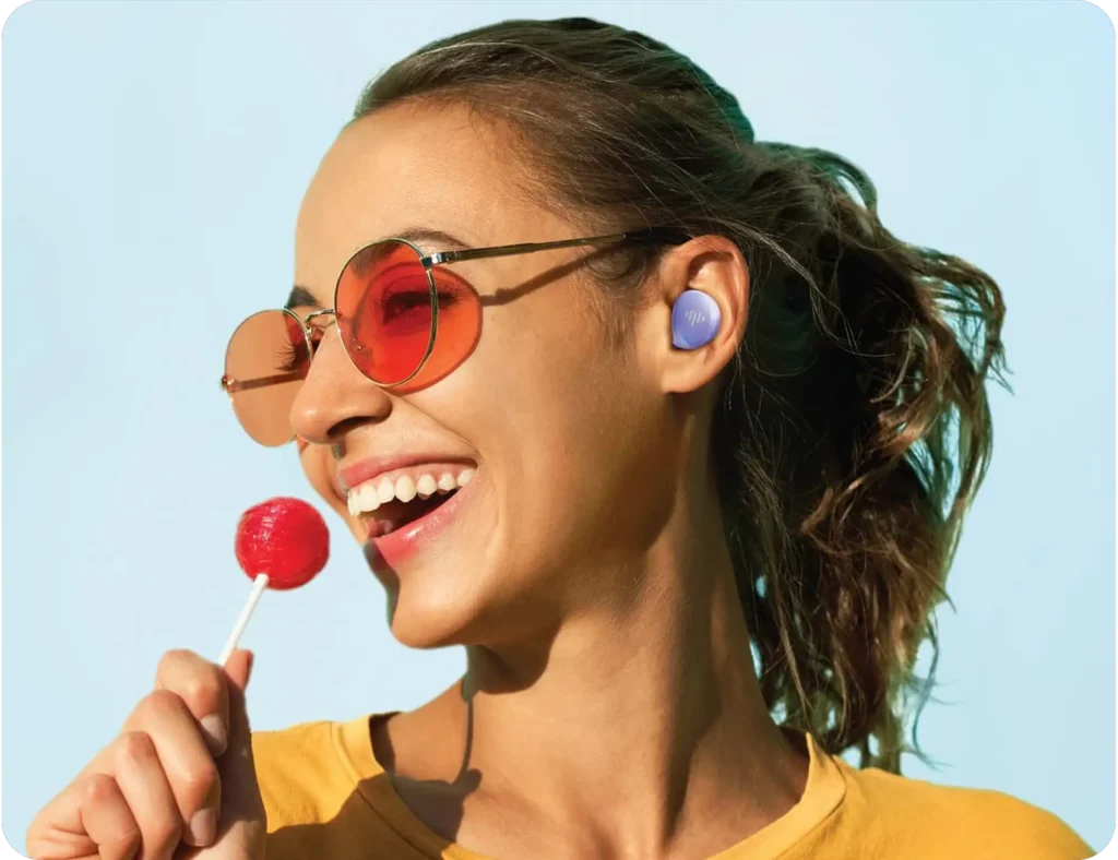 Audífonos inalámbricos Bluetooth con micrófono integrado y estuche portátil de hasta 5 horas de autonomía. Disponibles en colores vibrantes como azul, blanco, púrpura, rosa y verde. Ideales para escuchar música mientras viajas, haces ejercicio o te relajas en casa.