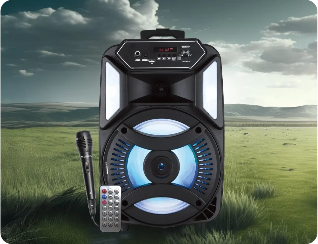 Parlante amplificador Bluetooth con 1100W de potencia, luces LED y micrófono incluido. Perfecto para fiestas al aire libre, reuniones familiares y días de playa.